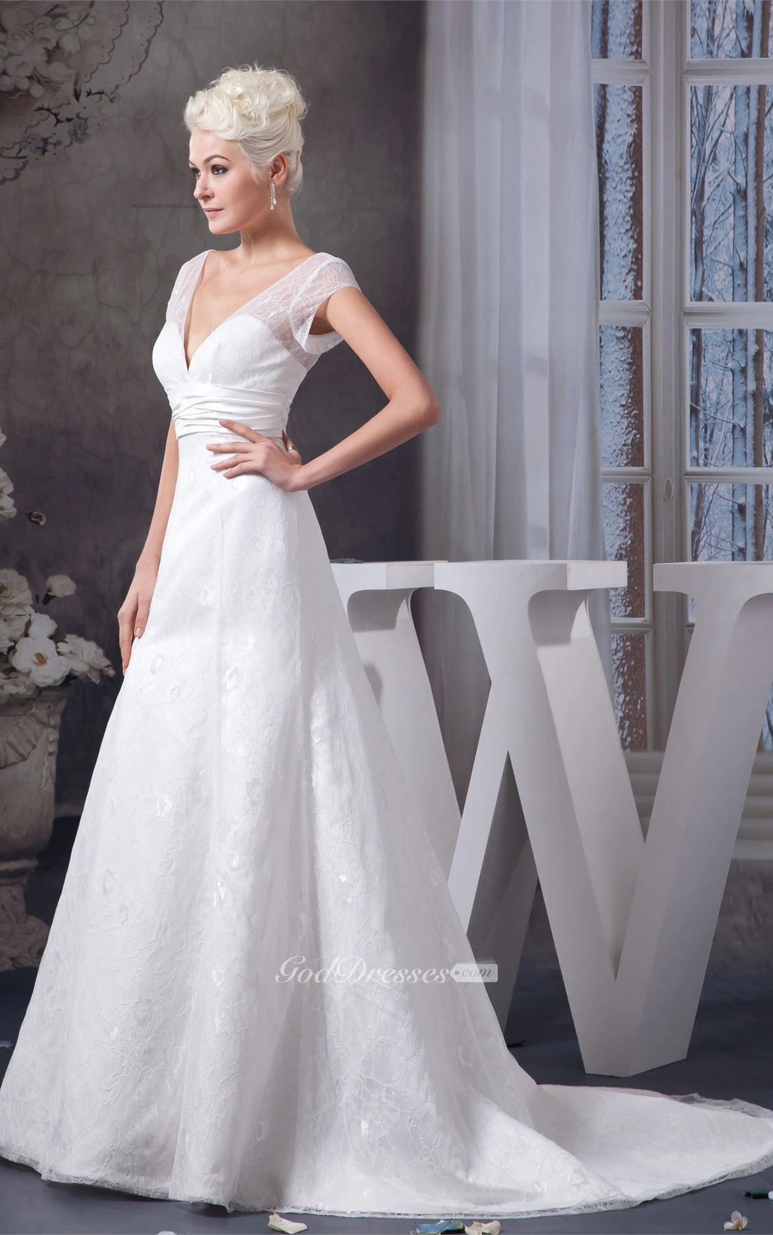 Plunged A-Line Caped-Sleeve Ruched Waist and Gown With Lace