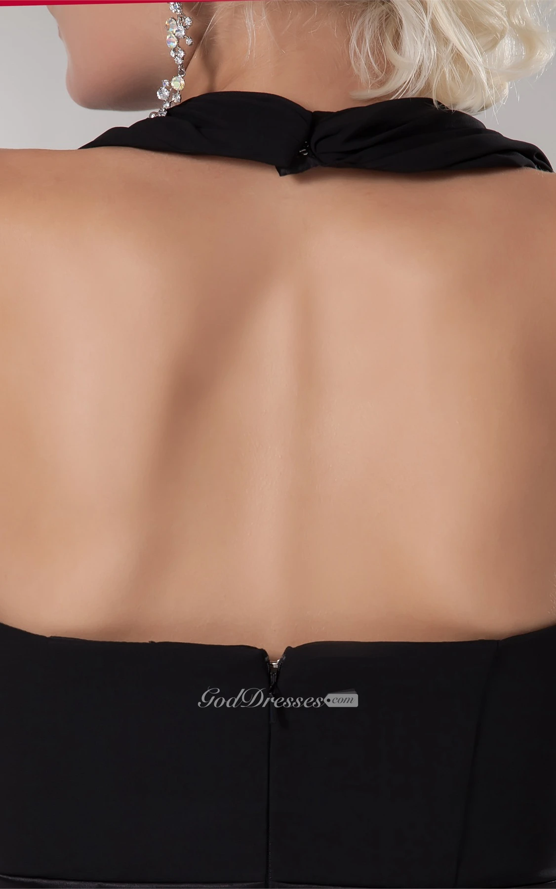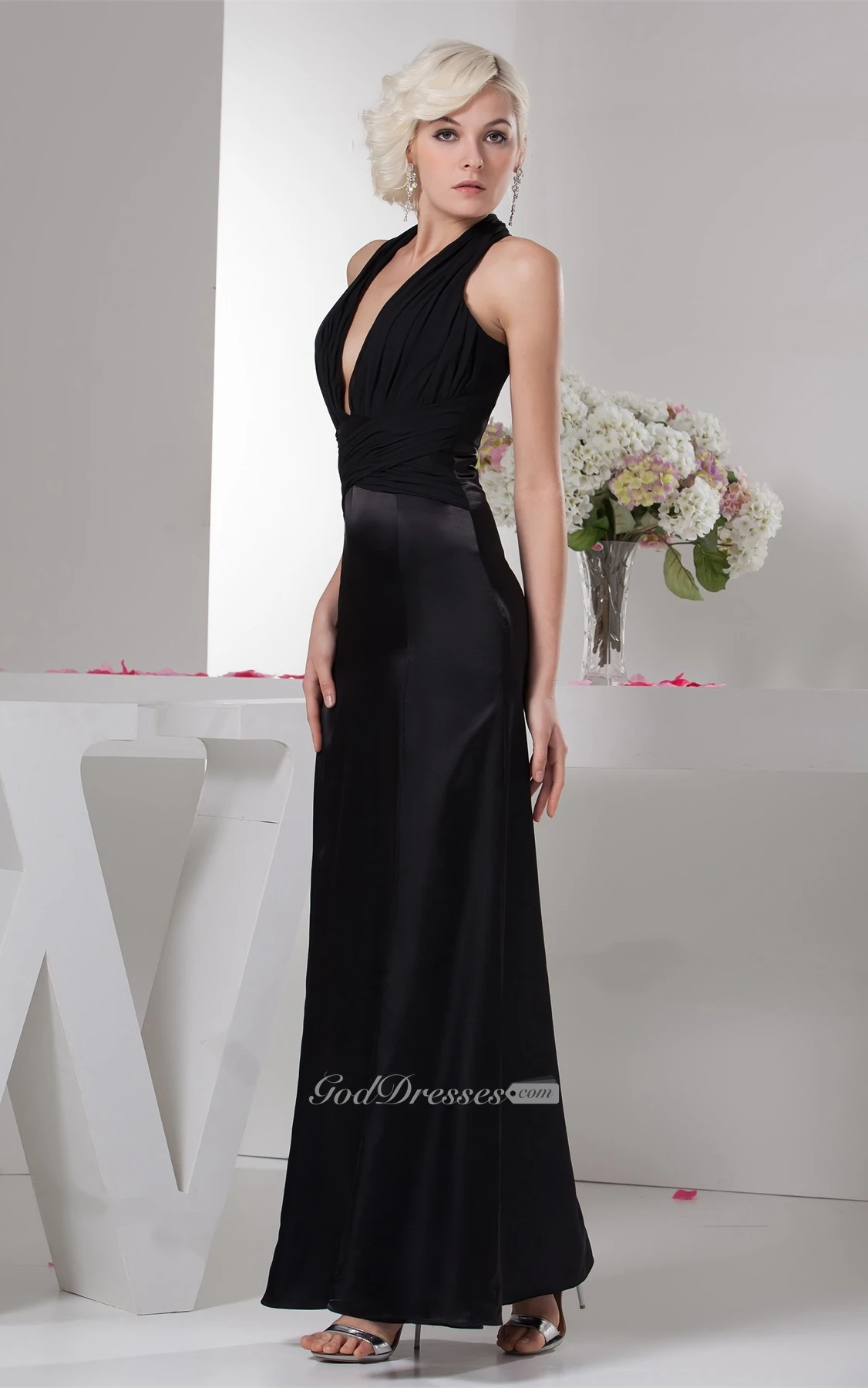 Plunged Ankle-Length Satin Halter and Dress With Ruching