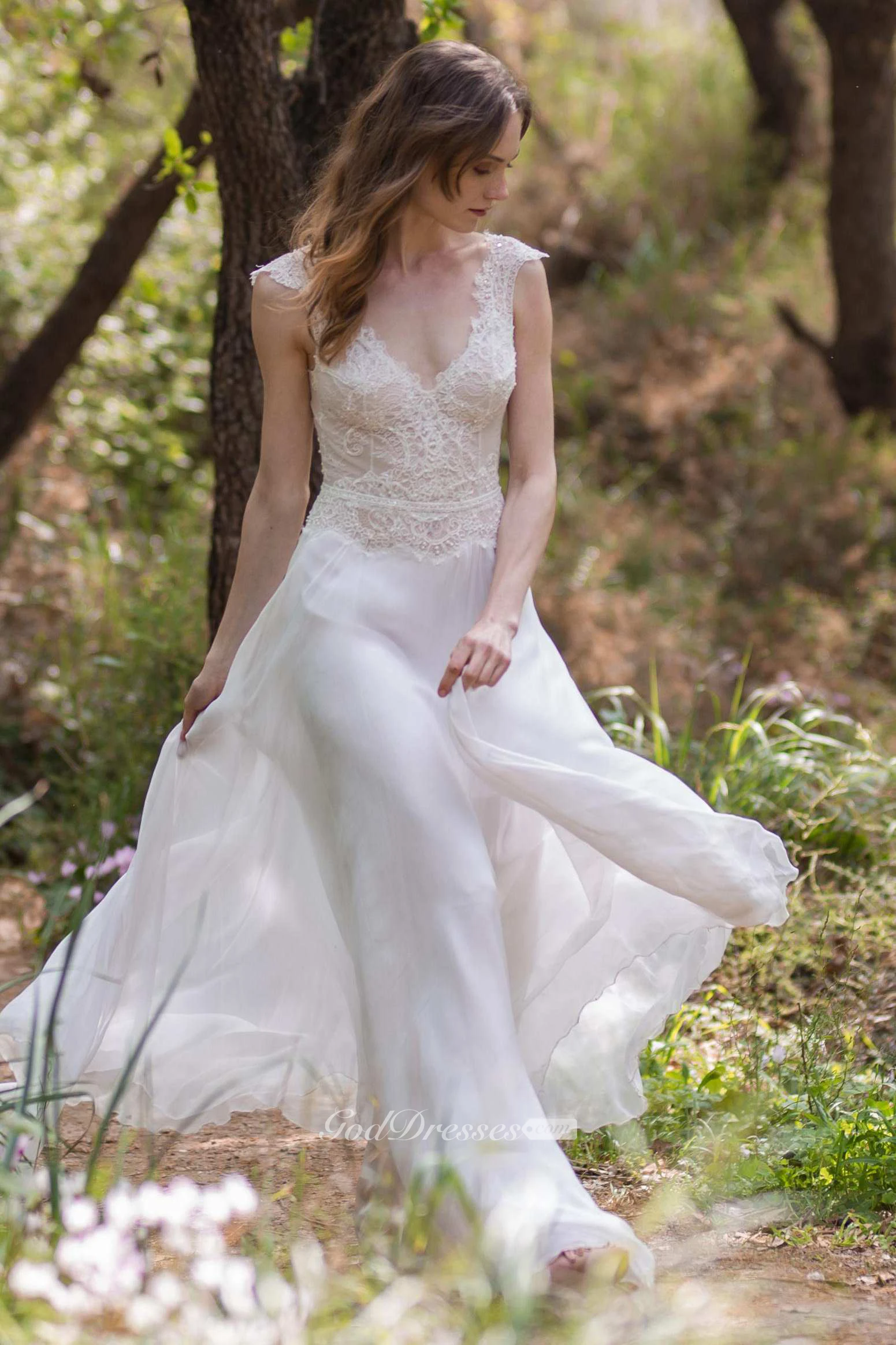 Plunged Cap-Sleeve Chiffon Sheath Wedding Dress With Lace