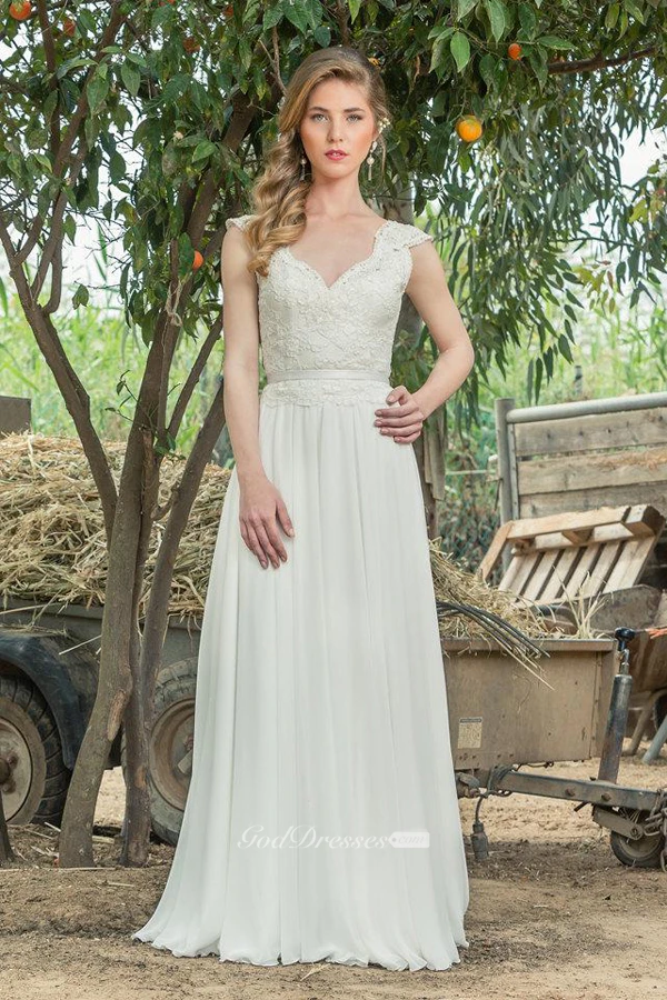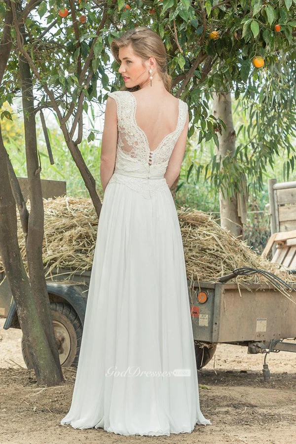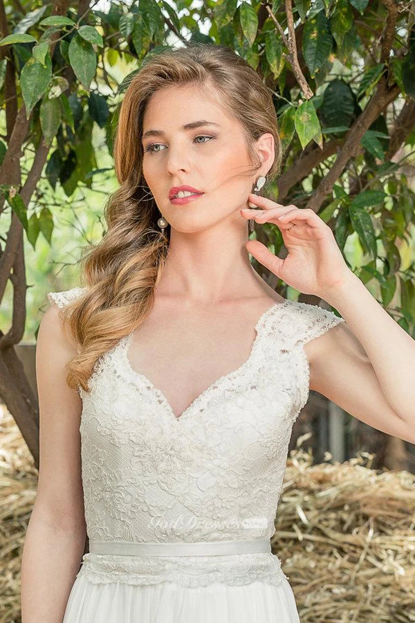 Plunged Cap-Sleeve Lace Chiffon Pleated Wedding Dress With Low-V Back