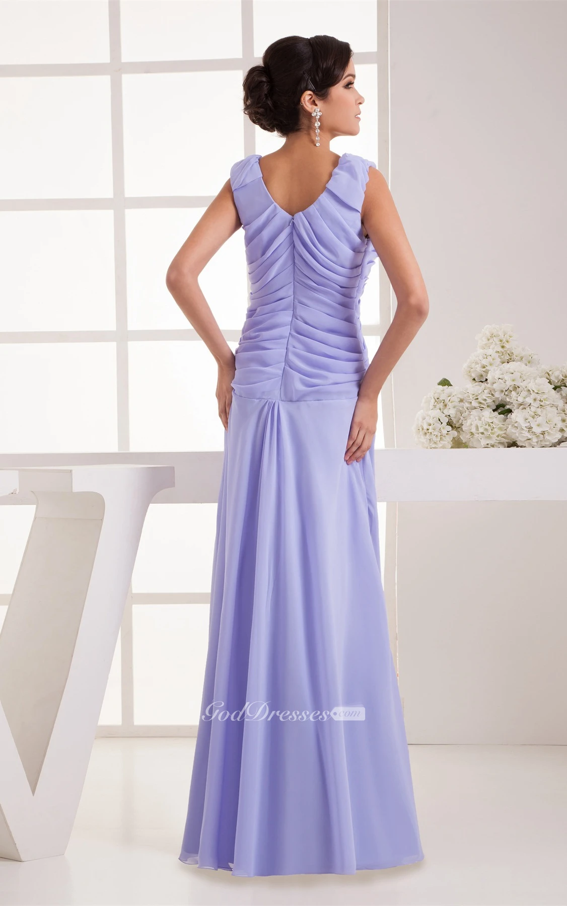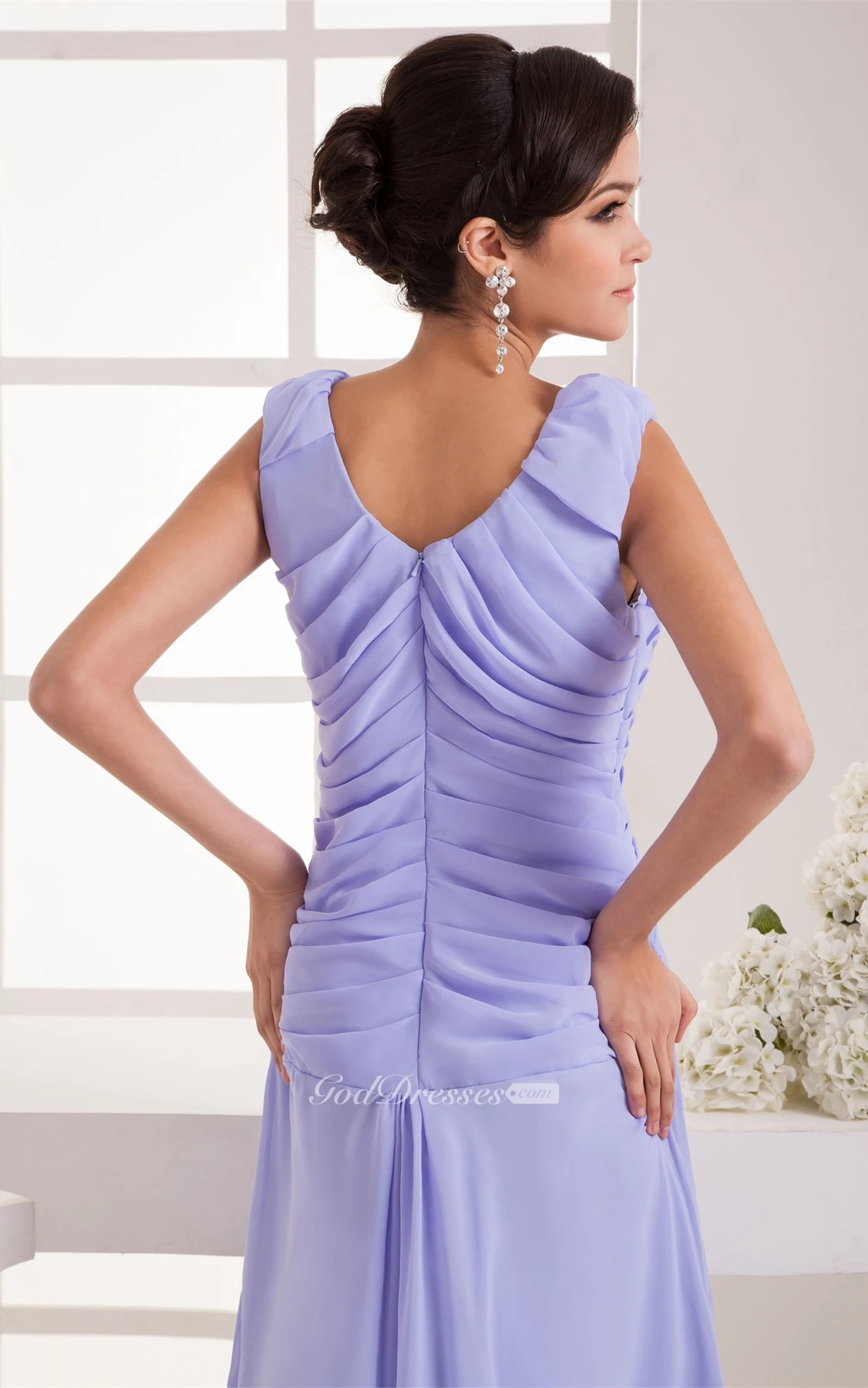 Plunged Chiffon Floor-Length Caped-Sleeve Pleats and Dress Illusion
