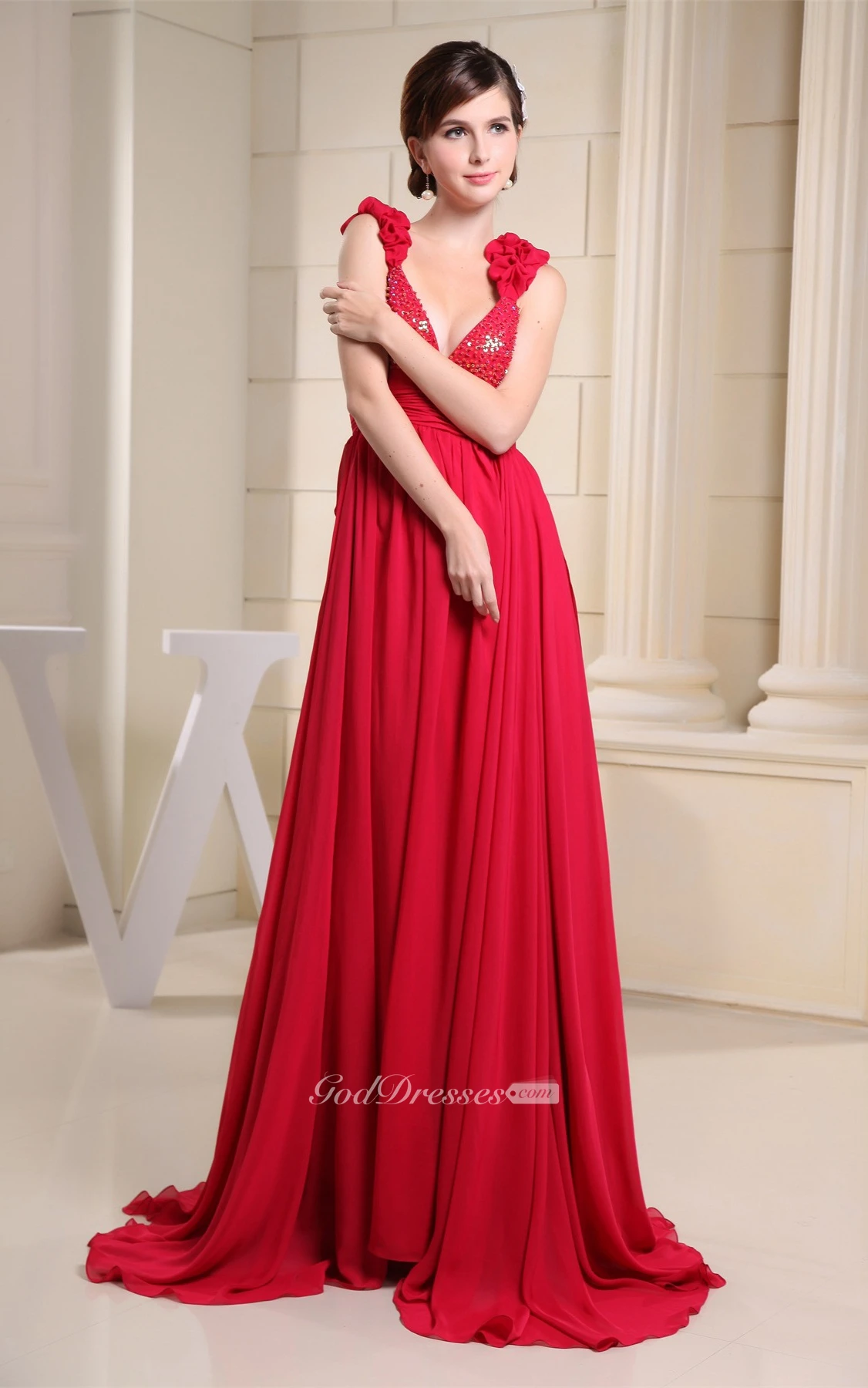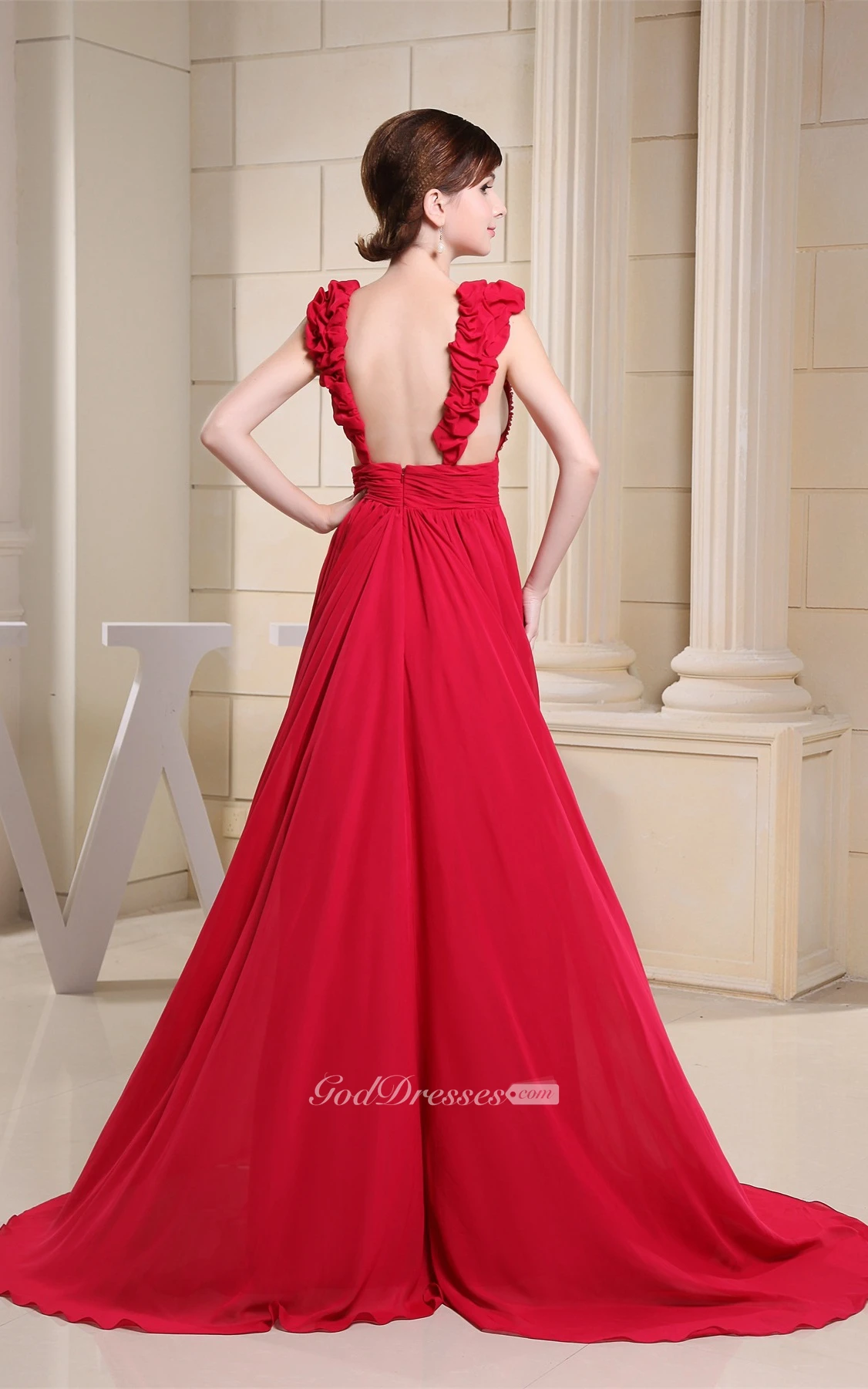 Plunged Floor-Length Chiffon Ruffled Straps and Dress With Beading