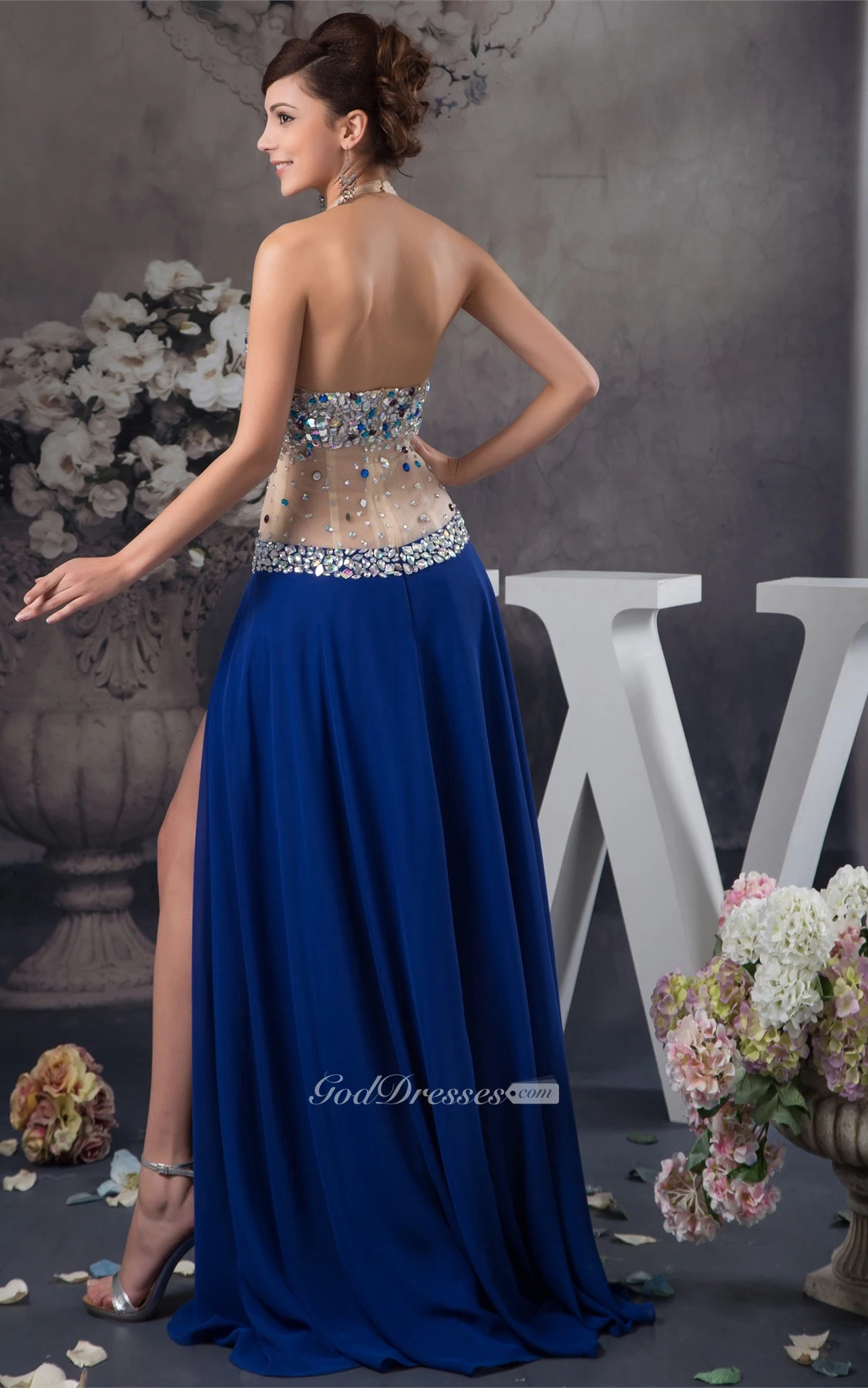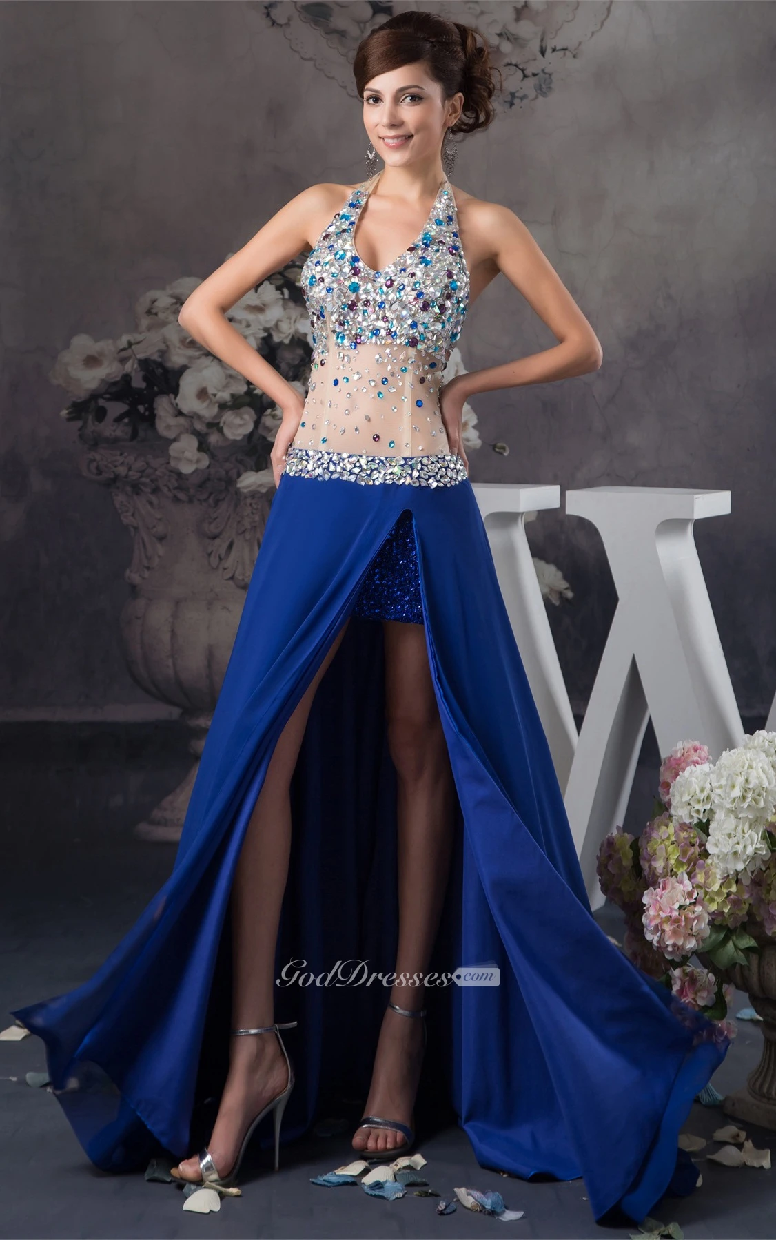Plunged Front-Split Illusion Waist and Dress With Rhinestone