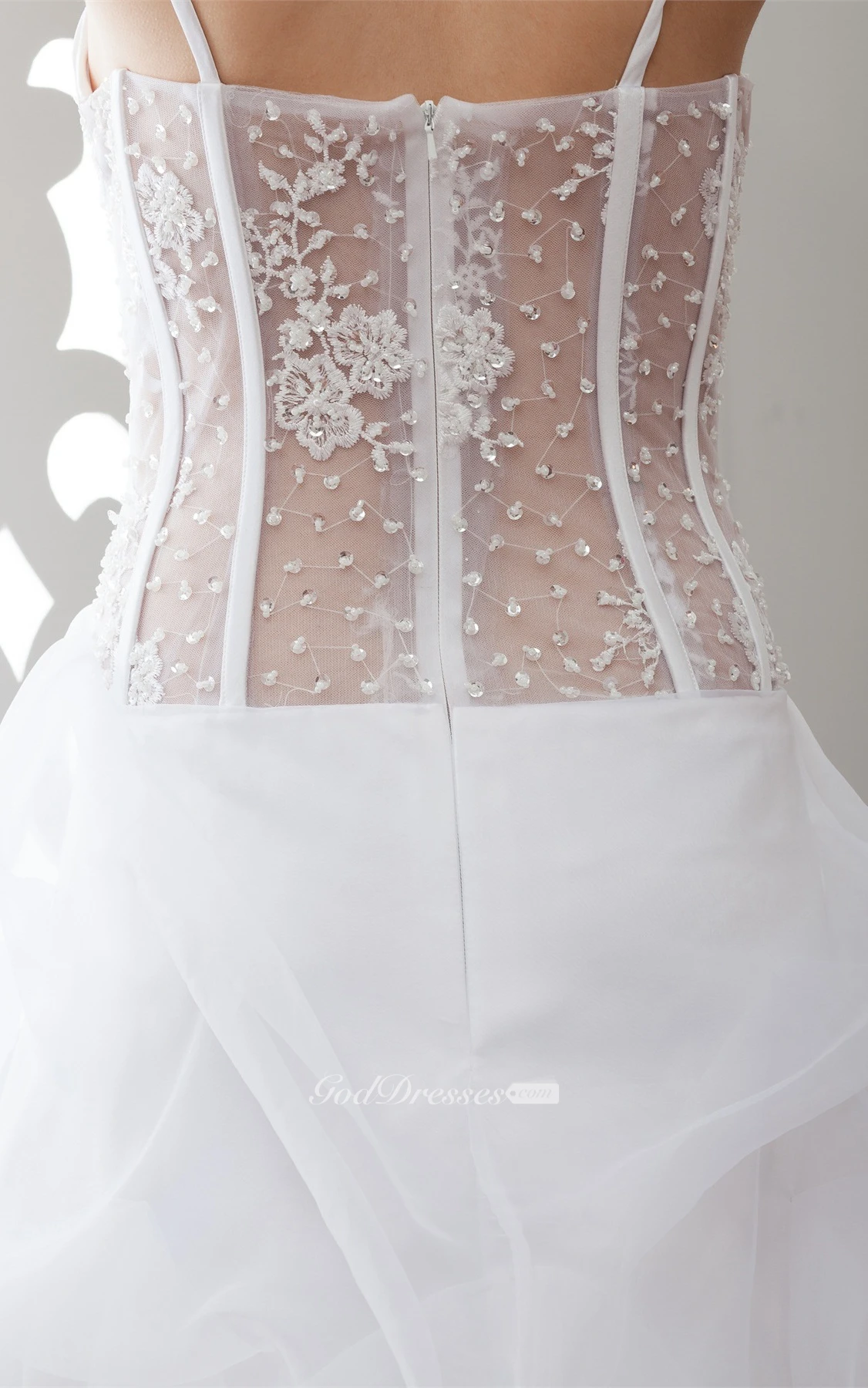 Plunged Front-Split Spaghetti-Strap Illusion Waist and Dress With Appliques
