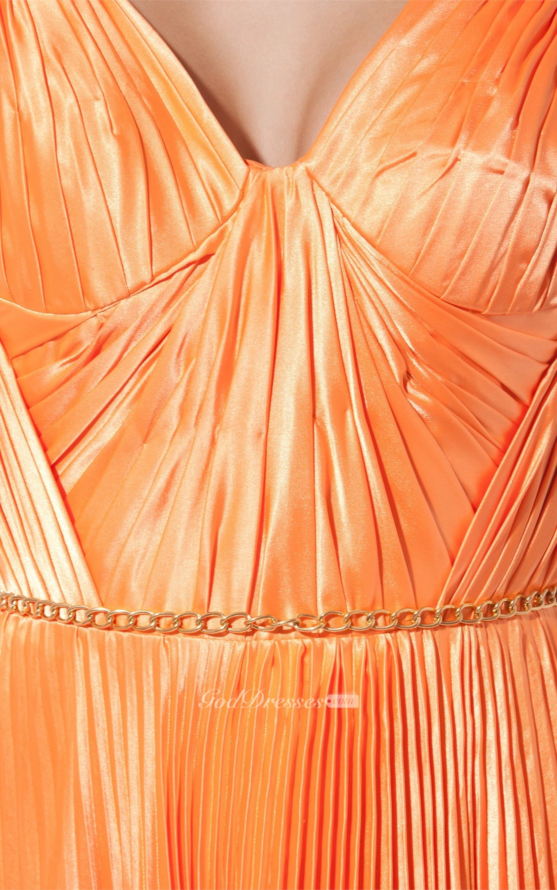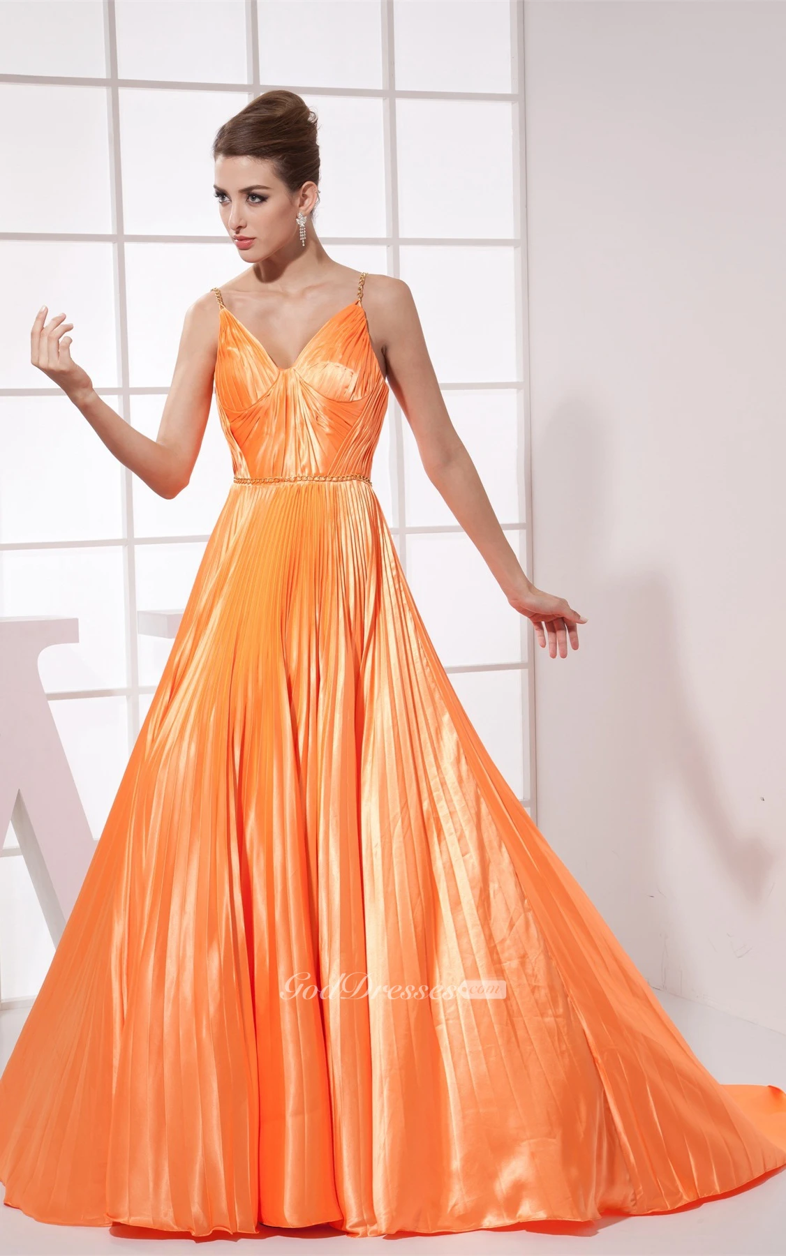 Plunged Pleated A-Line Gown With Spaghetti Straps