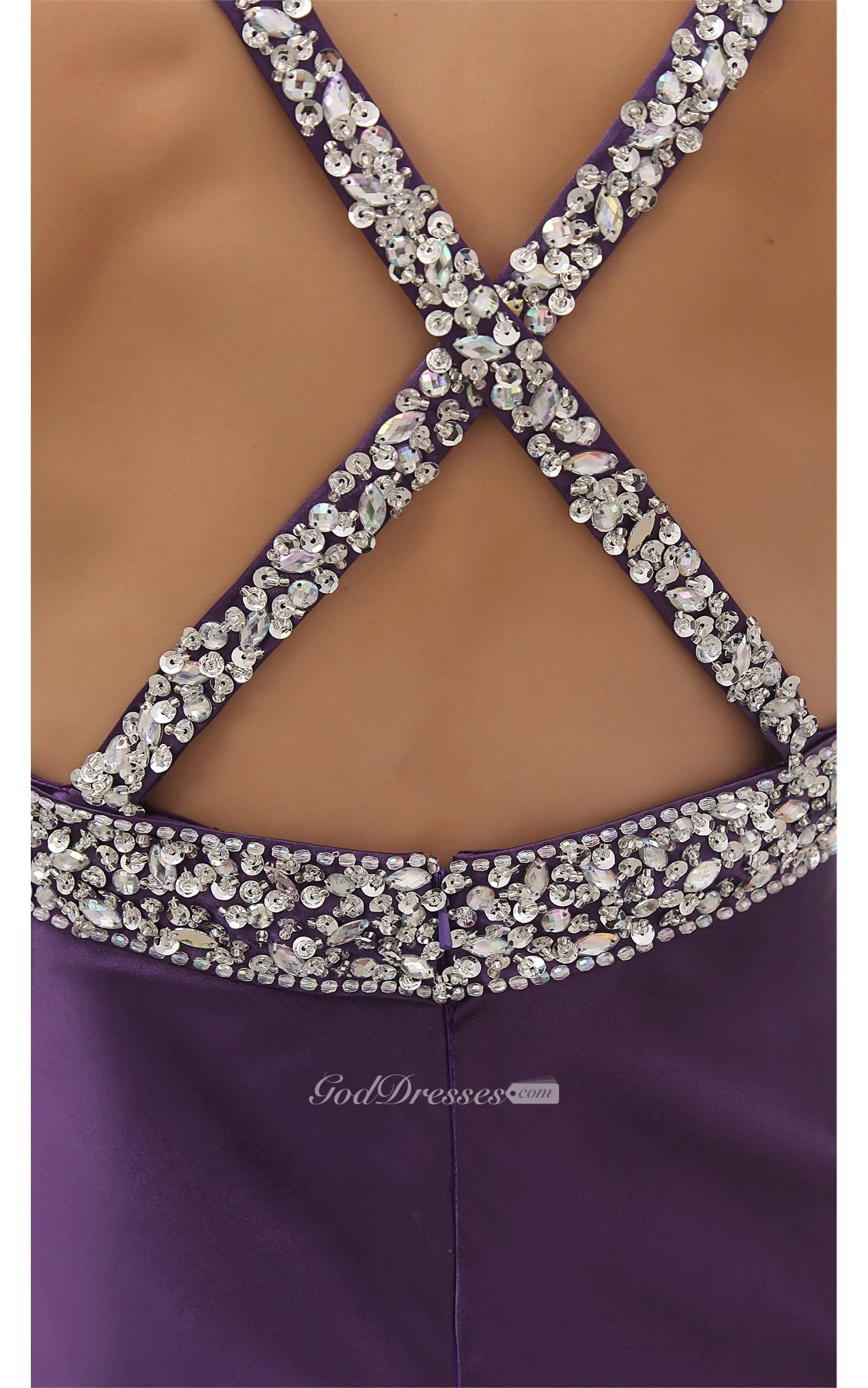 Plunged Satin Front-Split Brush Train and Dress With Gemmed Waist