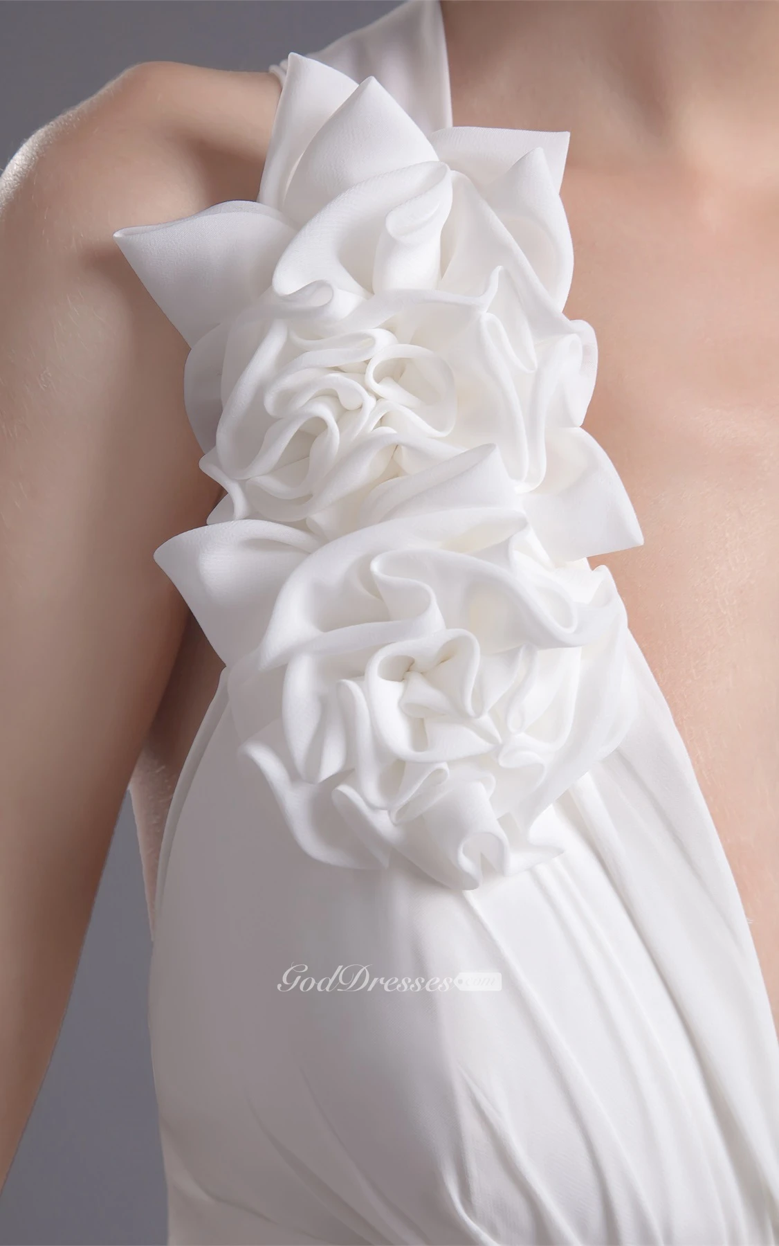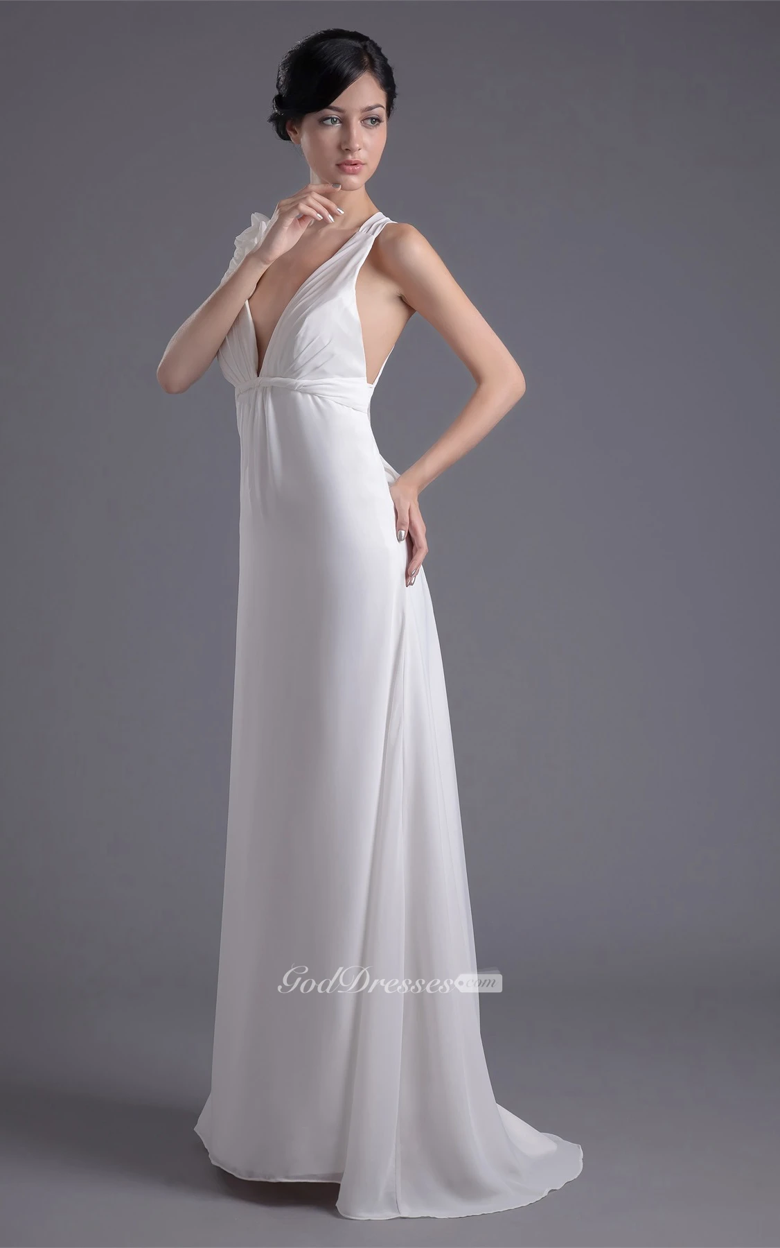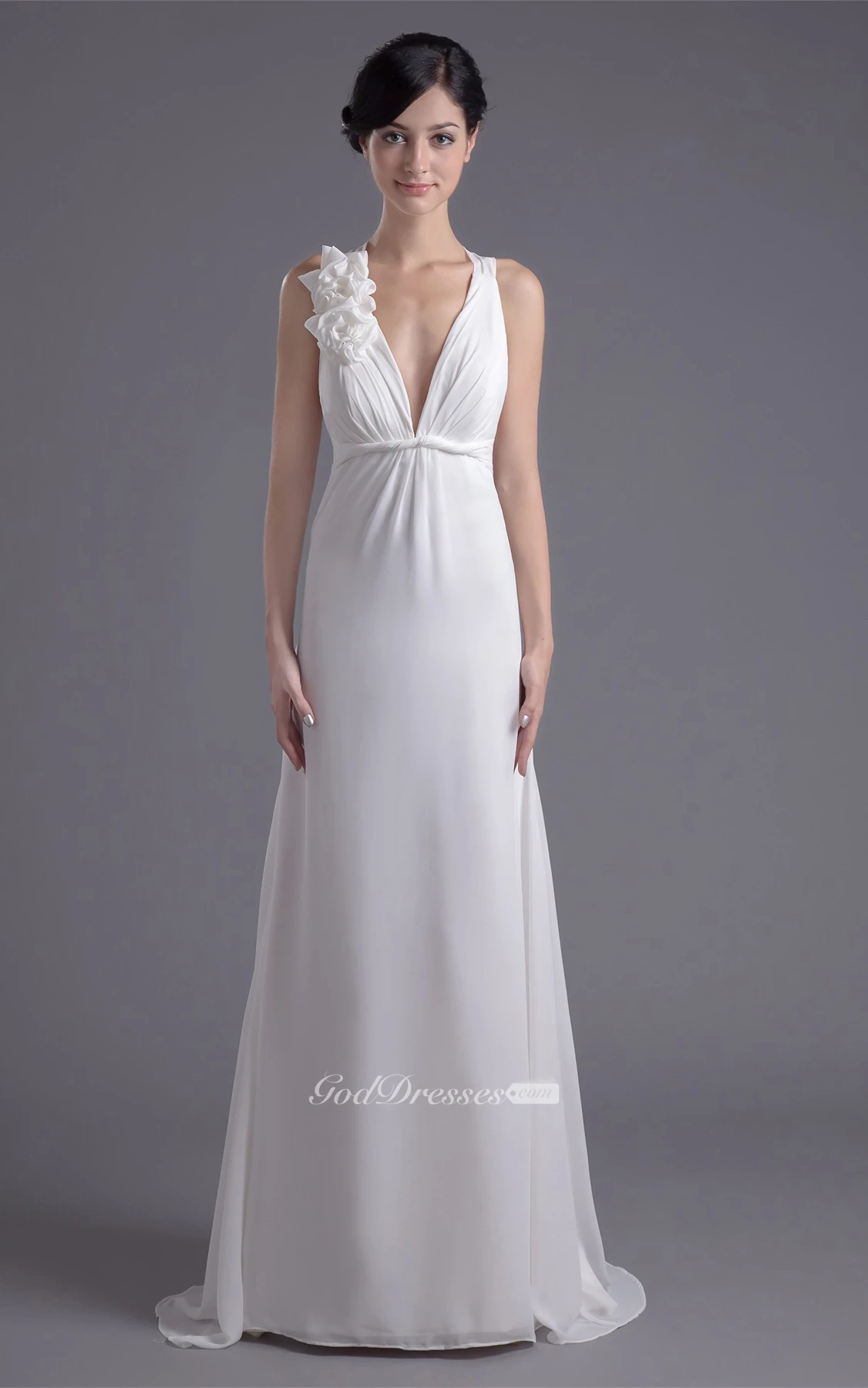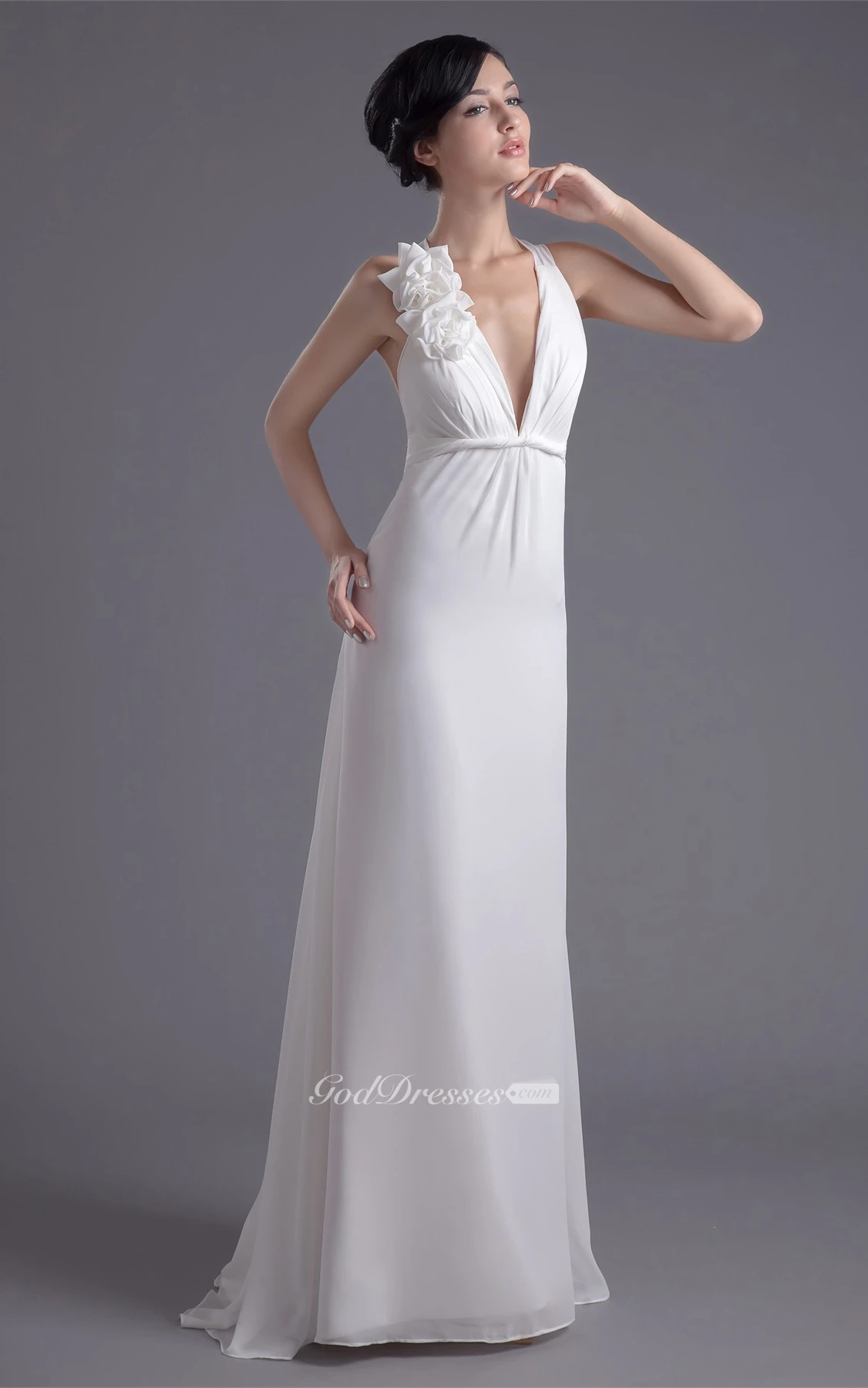 Plunged Sheath Sleeveless Ruched Waist and Dress With Flower