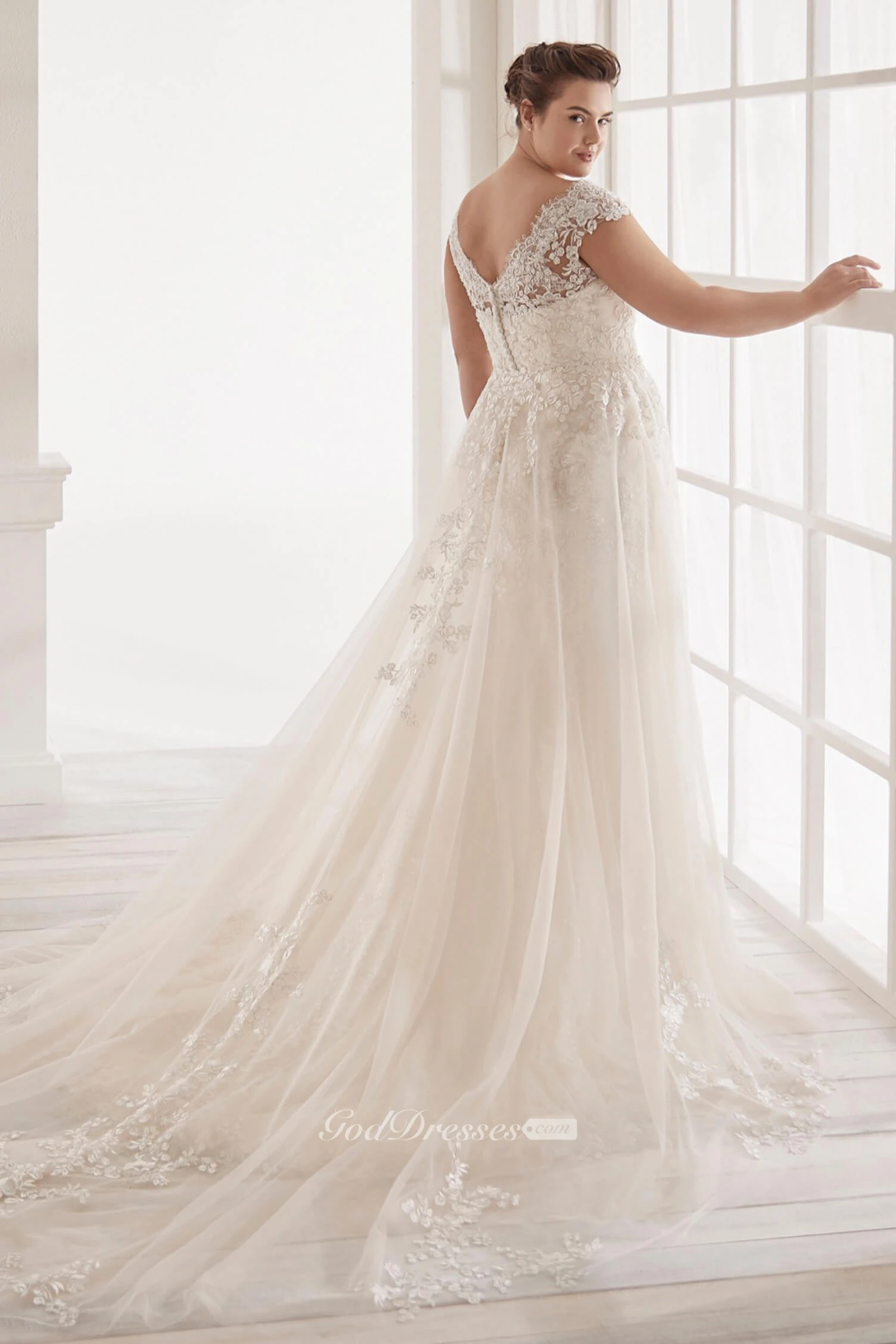 Plunging Detachable Lace Wedding Dress With V-neck Elegant Plus Size Cap Sleeve