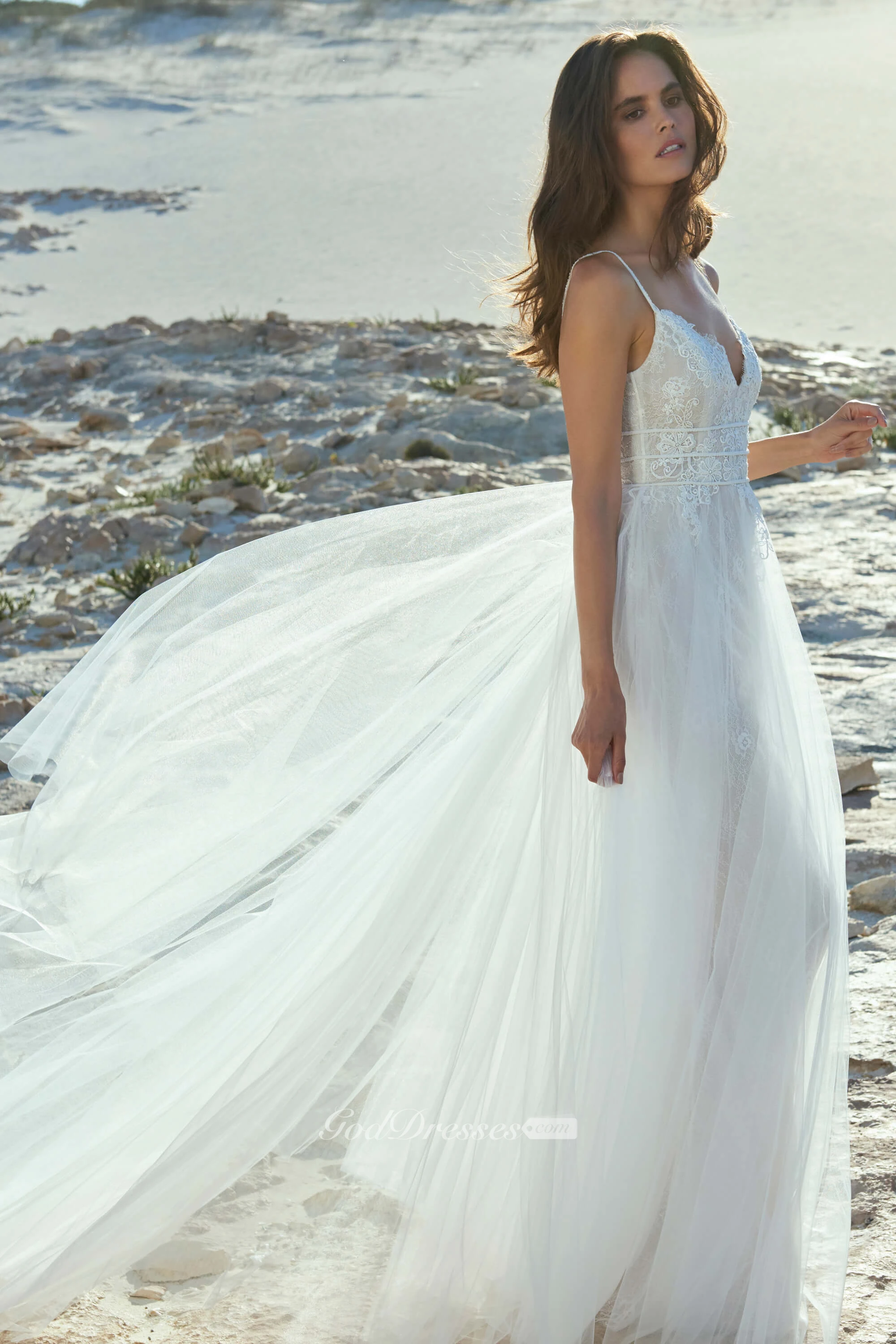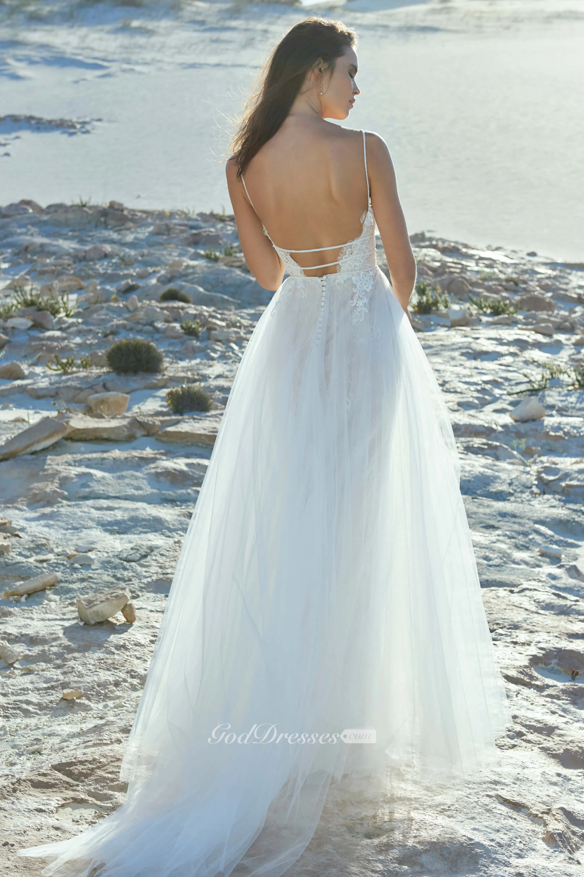 Plunging Tulle Spaghetti Sexy Wedding Dress With Lace Top And Open Back With Straps