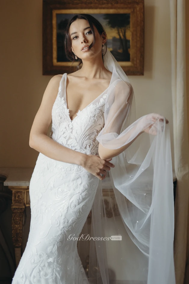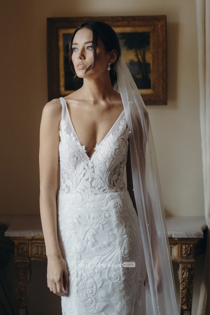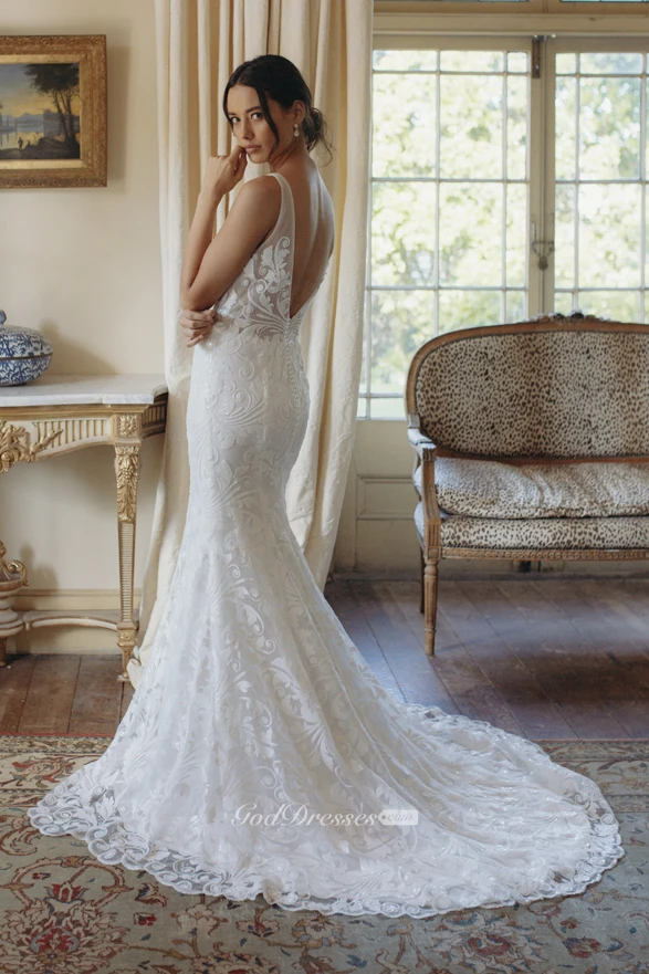 Plunging V-neck Sexy Mermaid Sleeveless Lace Court Train Bridal Gown With Deep V-back