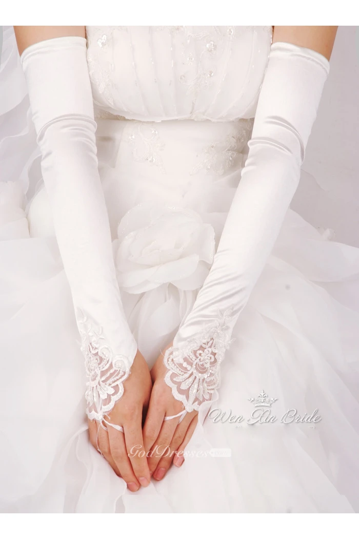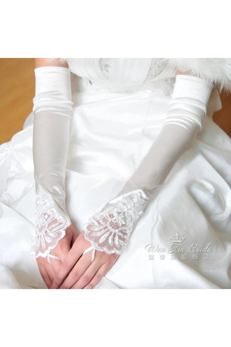 Plus Long White Beaded Satin Hook Elastic Satin Gloves