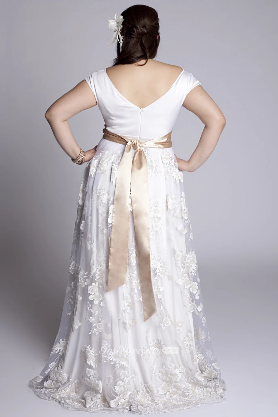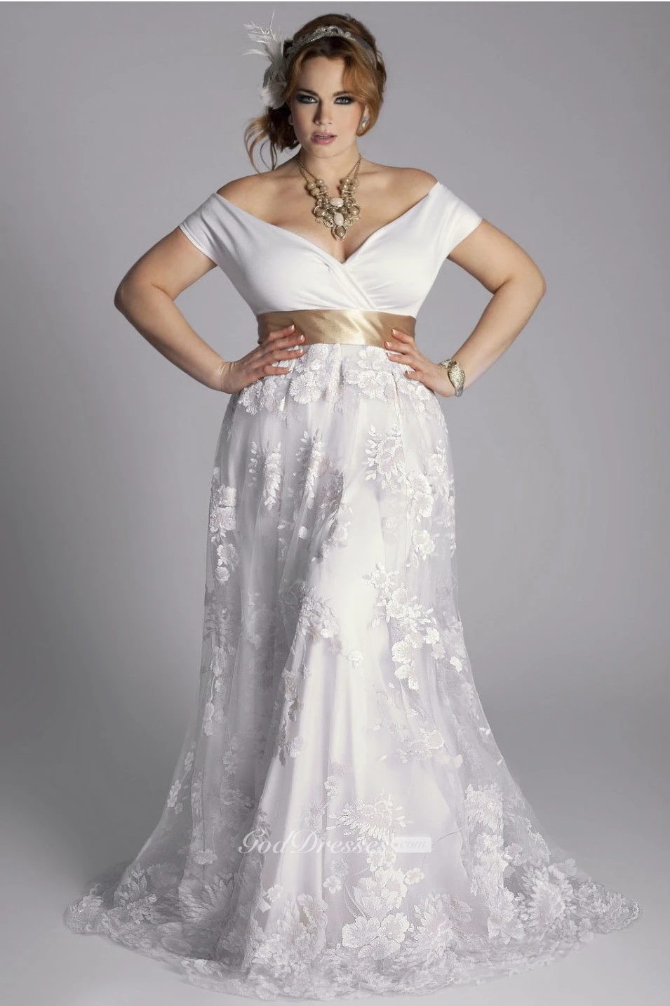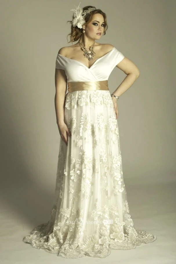 Plus Size Off-Shoulder A-Line Vintage Lace Floor Length Wedding Gown With Sash