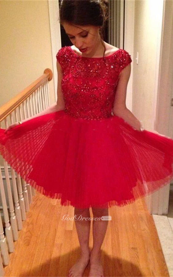 Popular Short A-line Cap Sleeve Tulle Dress With Beading