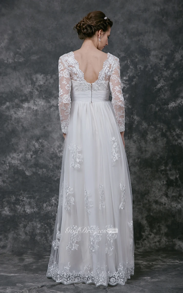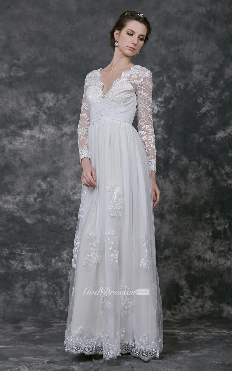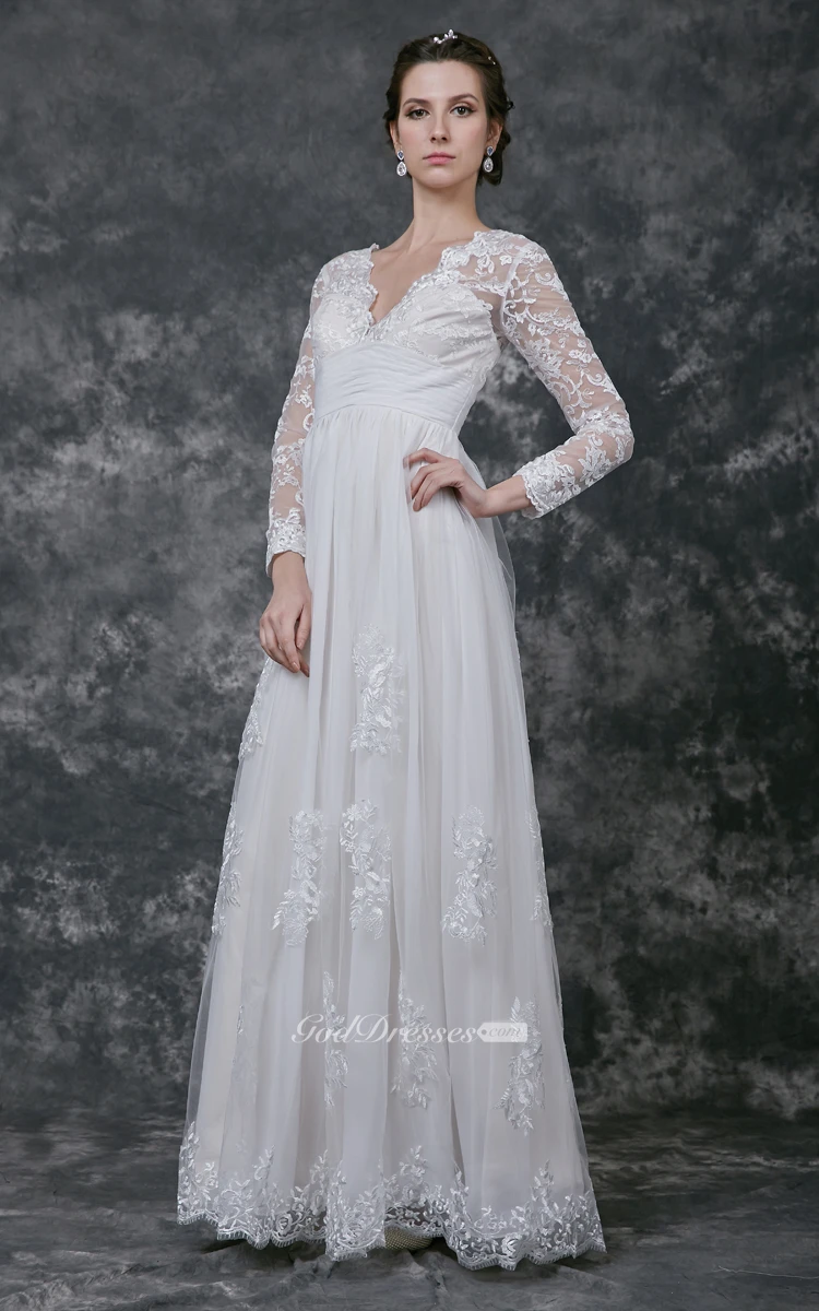 Radiant Long Sleeve V-neck A-line Long Lace Dress With Appliques