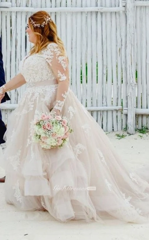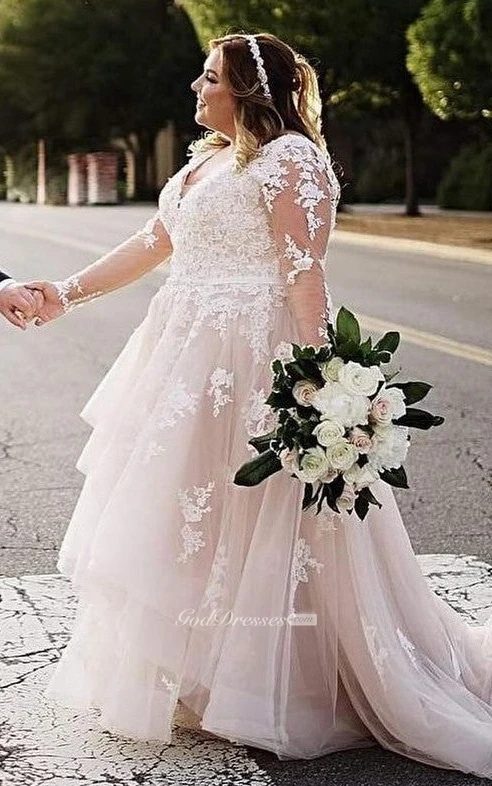Romantic A Line Lace Floor-length Train Long Sleeve Wedding Dress with Appliques