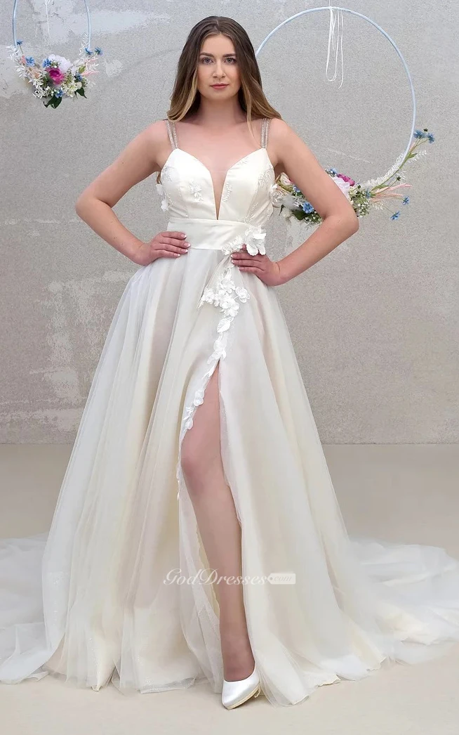 Romantic A Line Plunging Neckline Floor-length Sleeveless Tulle Wedding Dress with Appliques