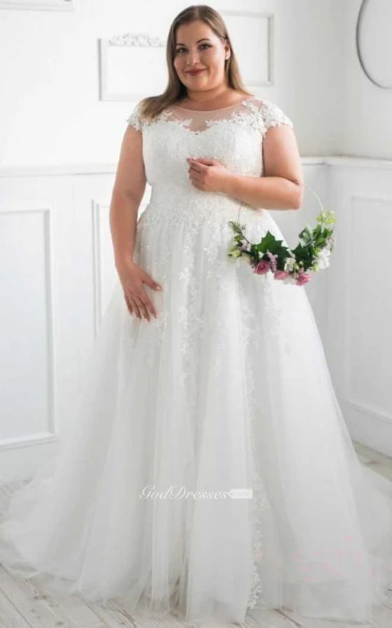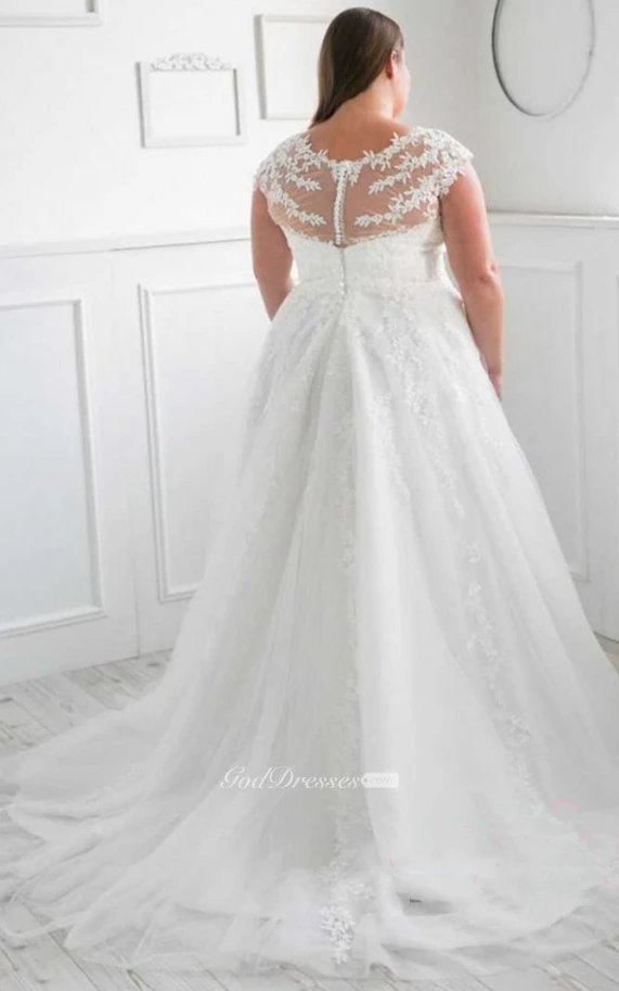 Romantic A Line Tulle Bateau Sweep Train Wedding Dress with Appliques