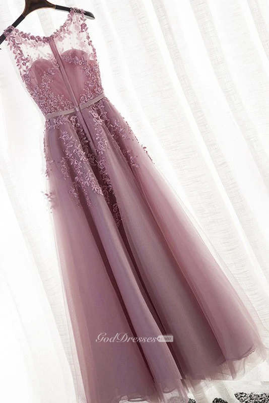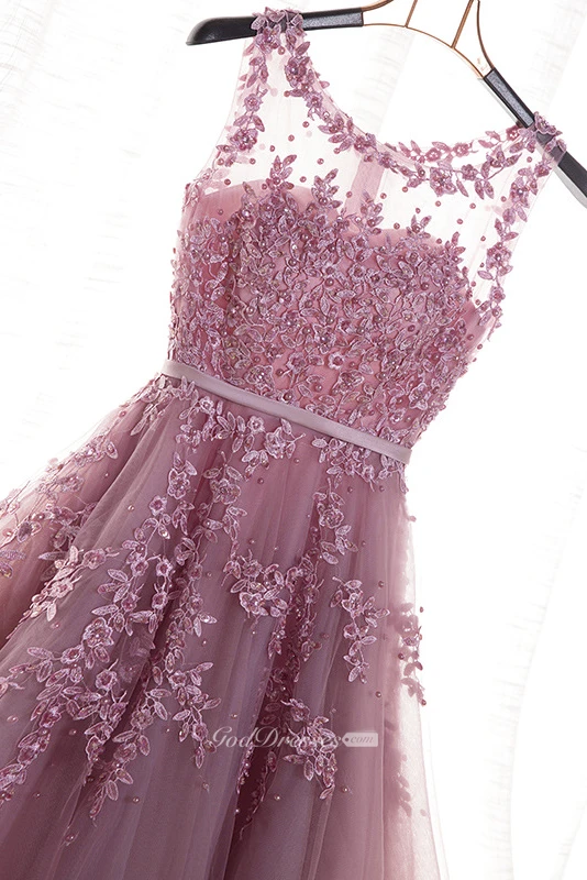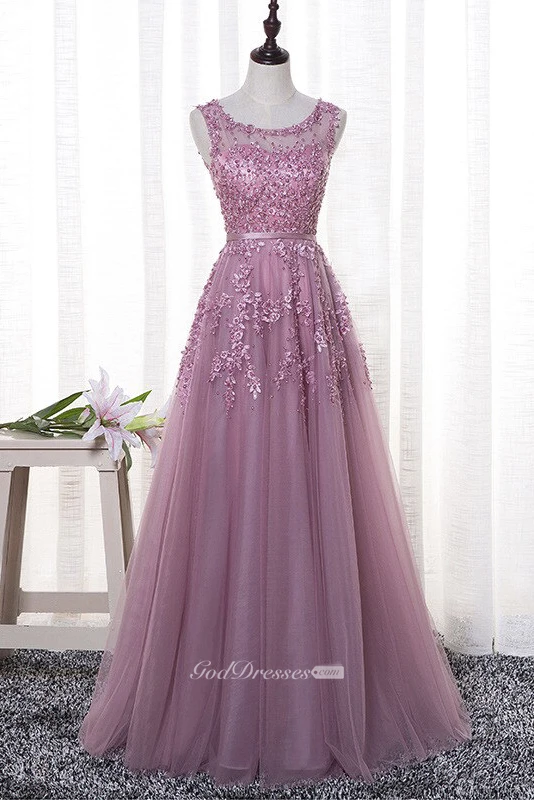 Romantic Bateau Sleeveless Tulle Floor-length Dress With Floral Appliques And Beading