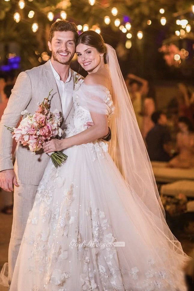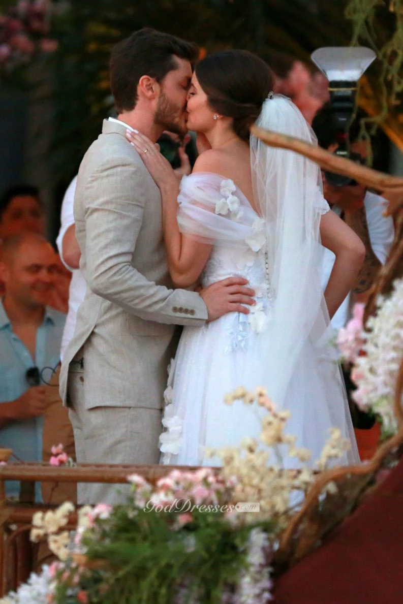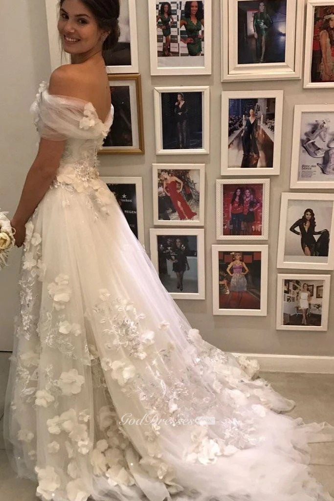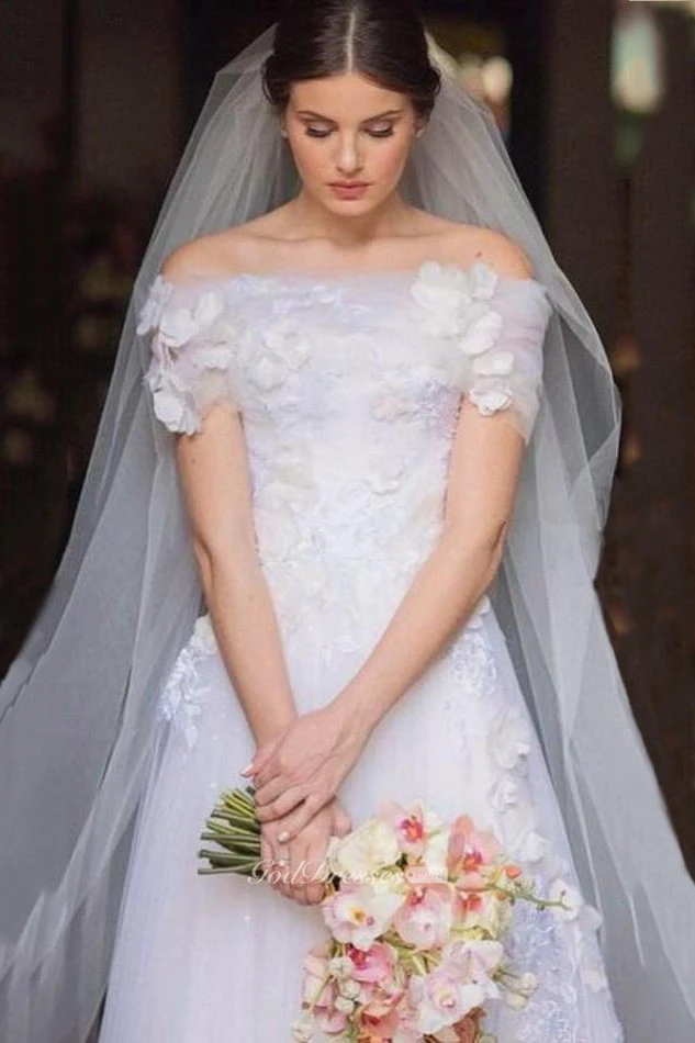 Romantic Garden Style Tulle A-line Off-the-shoulder Short Sleeve A-line Wedding Dress