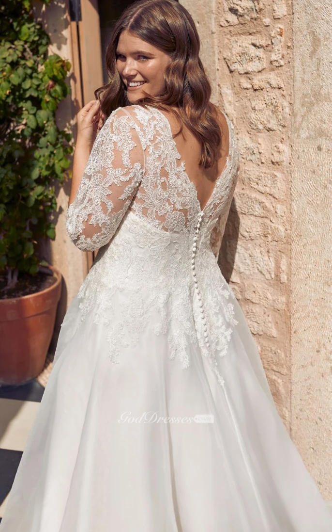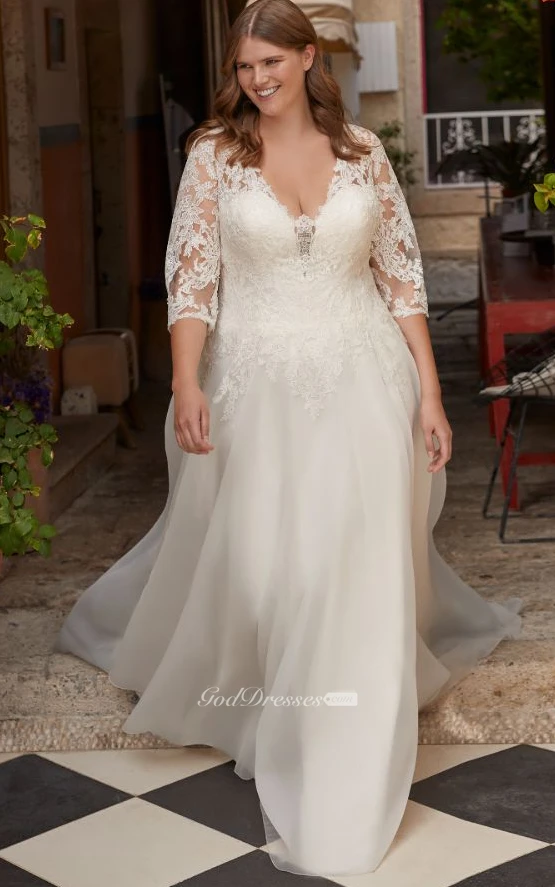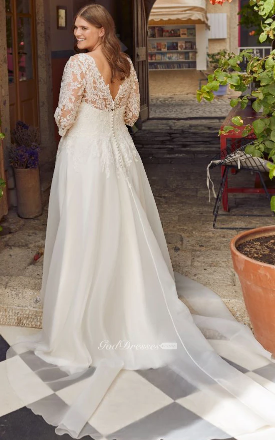 Romantic Lace A Line Floor-length Train 3/4 Length Sleeve Wedding Dress with Ruching