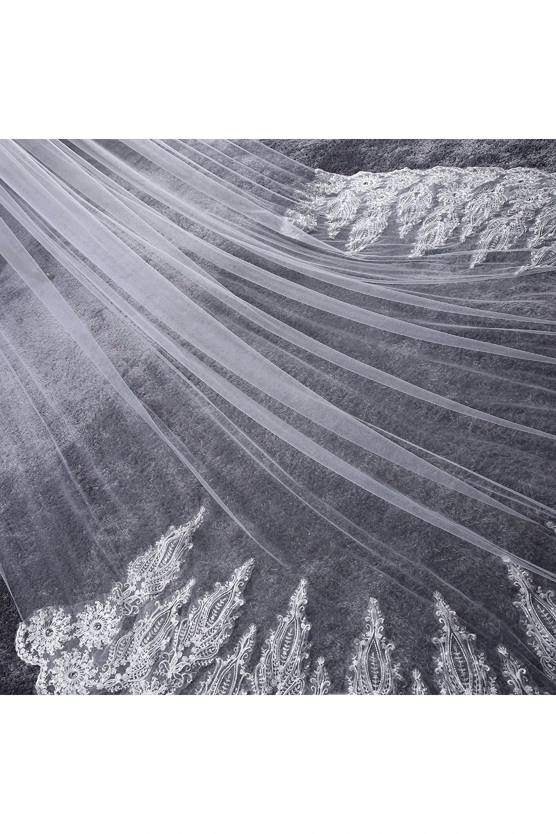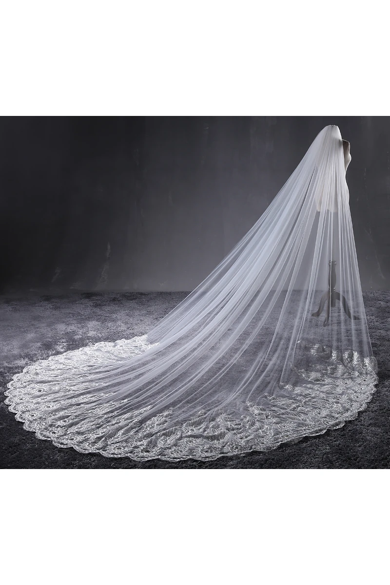 Romantic Lace Applique Long Trailing Rhinestone Tulle Veil