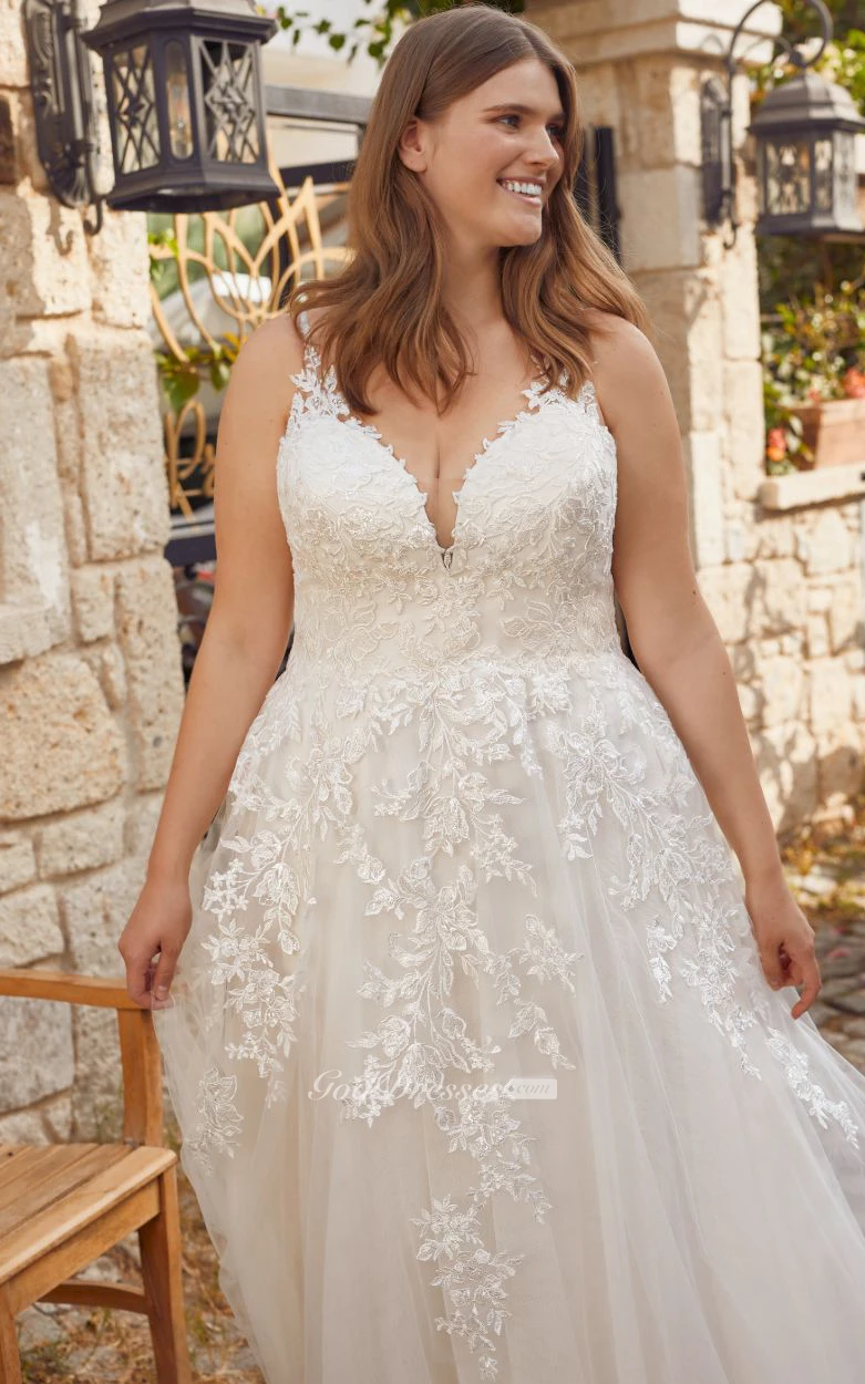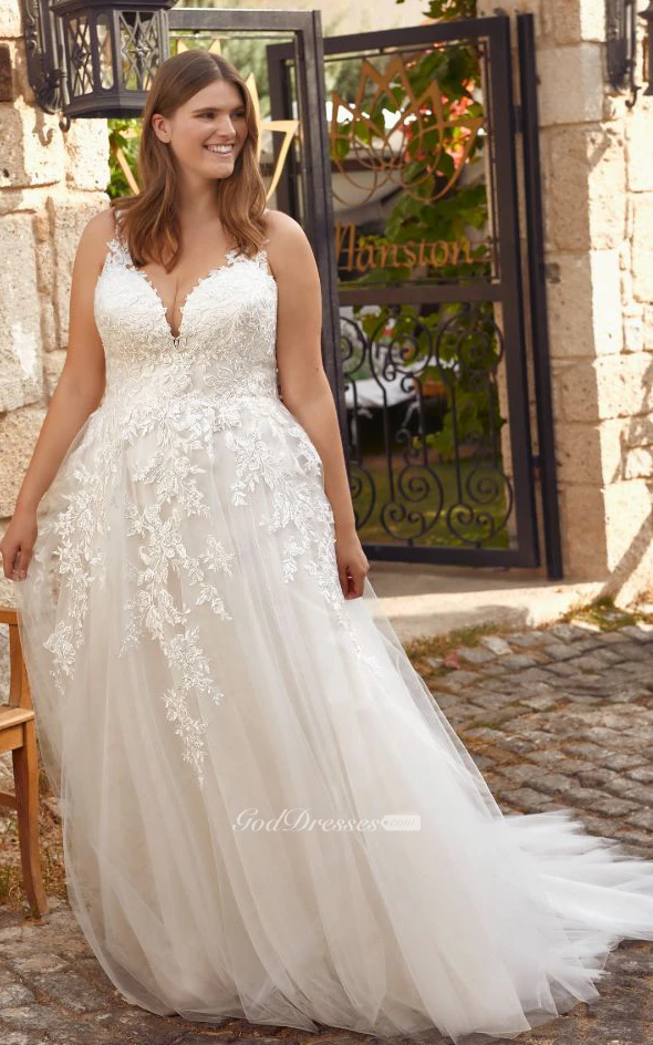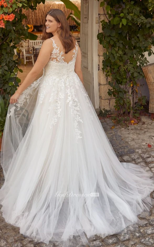 Romantic Lace Floor-length Train Sleeveless A Line Open Back Wedding Dress with Appliques