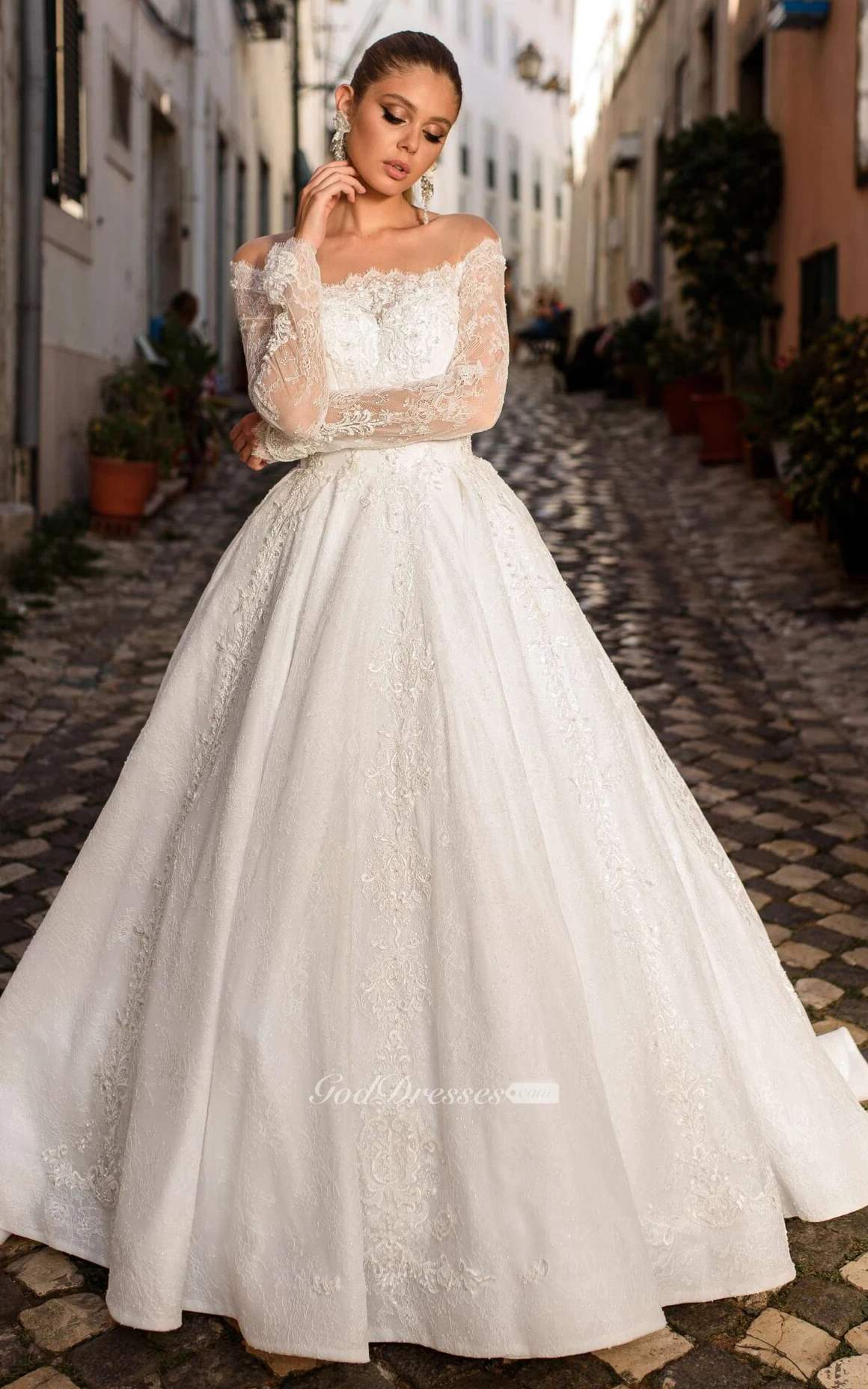 Romantic Lace Off-the-shoulder Long Sleeve Appliques Wedding Dress With Button
