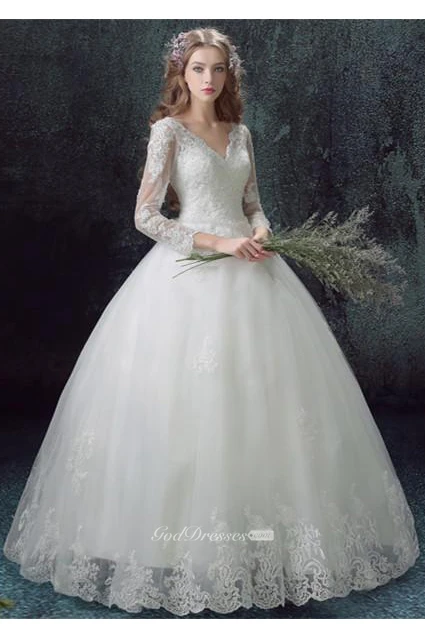 Romantic Lace Tulle Ball Gown Wedding Dress 3-4-Long Sleeve