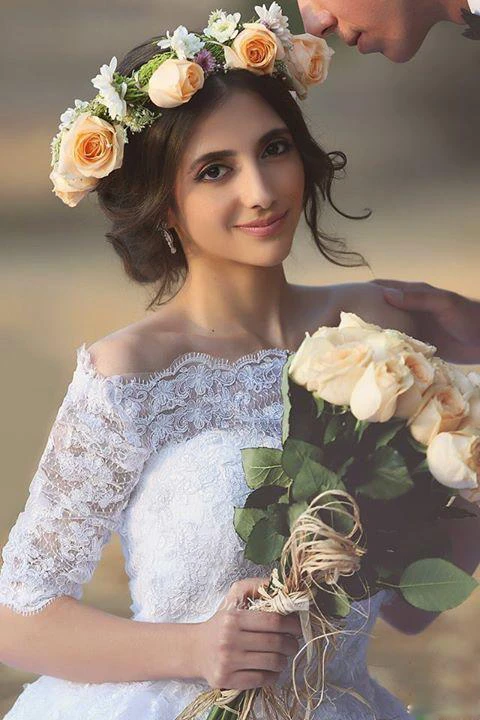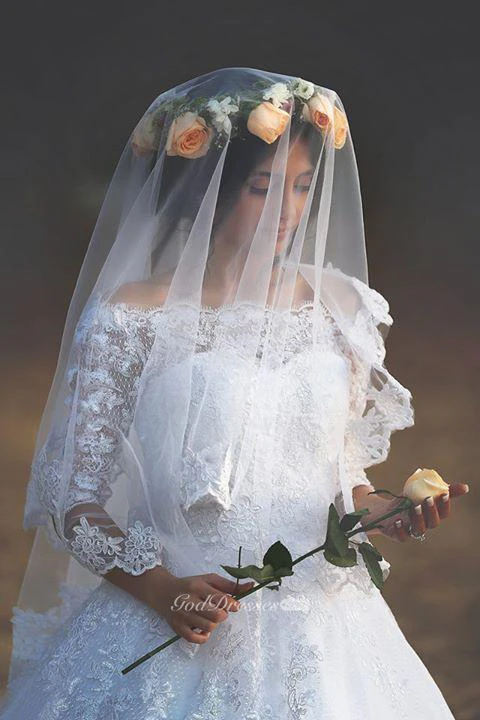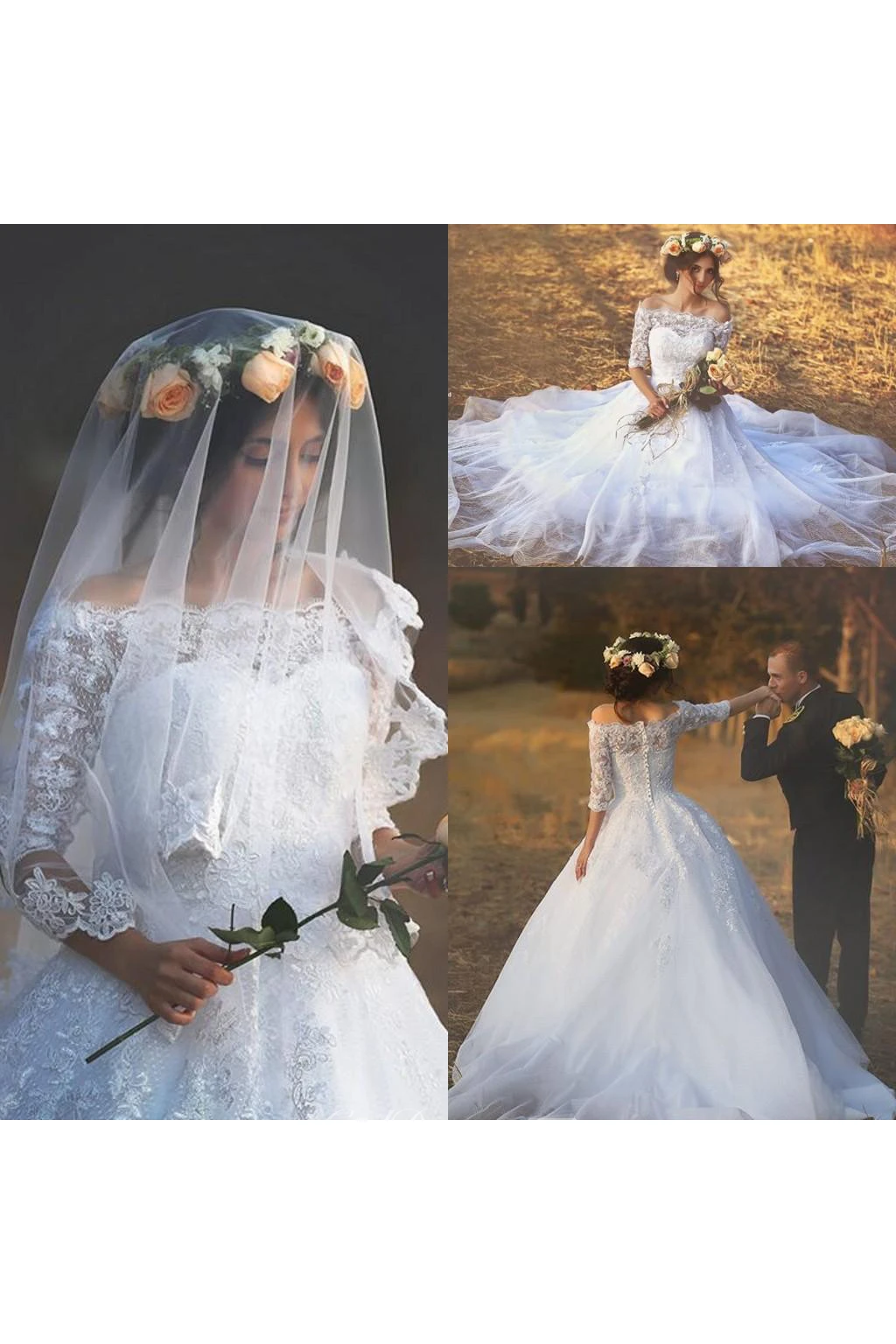 Romantic Off Shoulder Illusion Half Sleeve Button Back Appliques Lace Bridal Gown