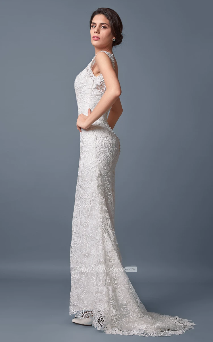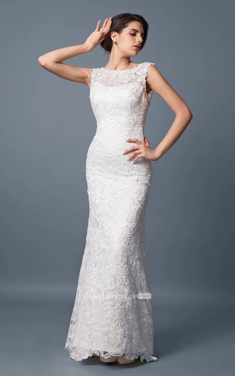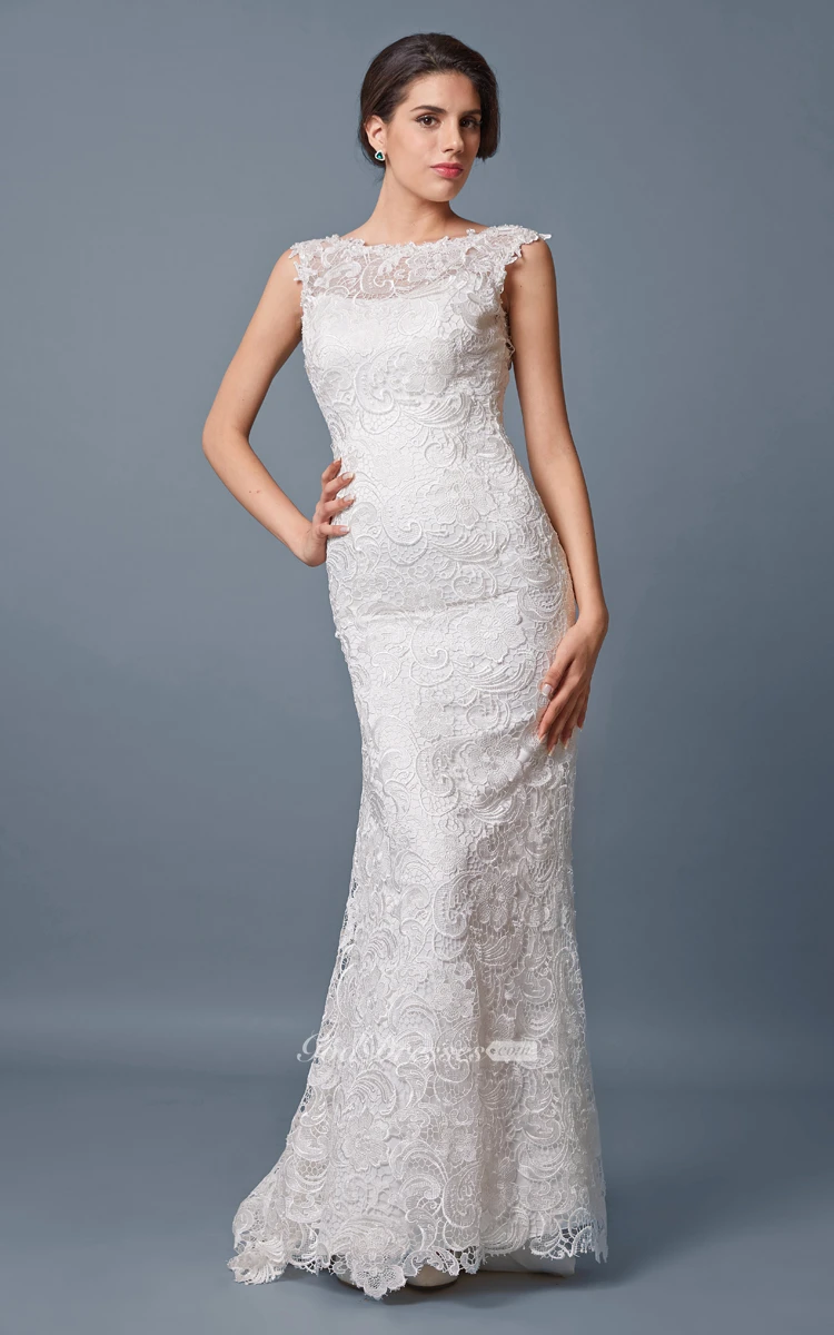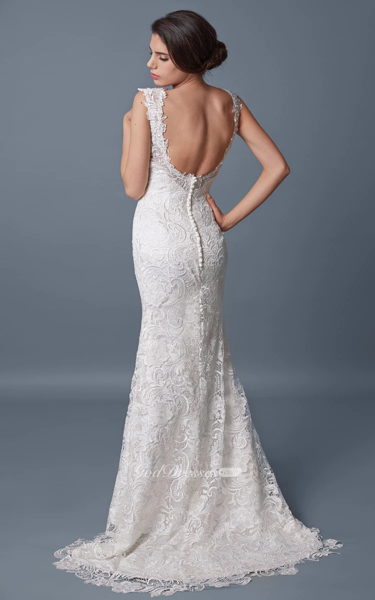 Romantic Off-shoulder Open Back Slim-line Lace and Charmeuse Wedding Gown