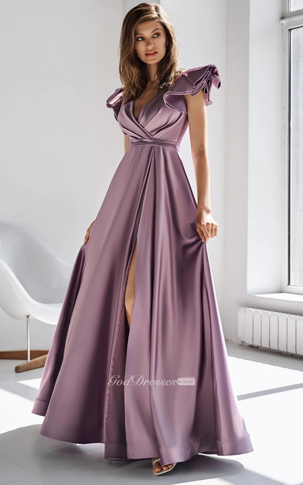 Romantic V-neck A Line Satin Floor-length Formal Dress with Ruching