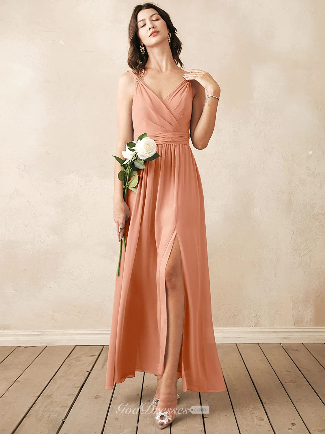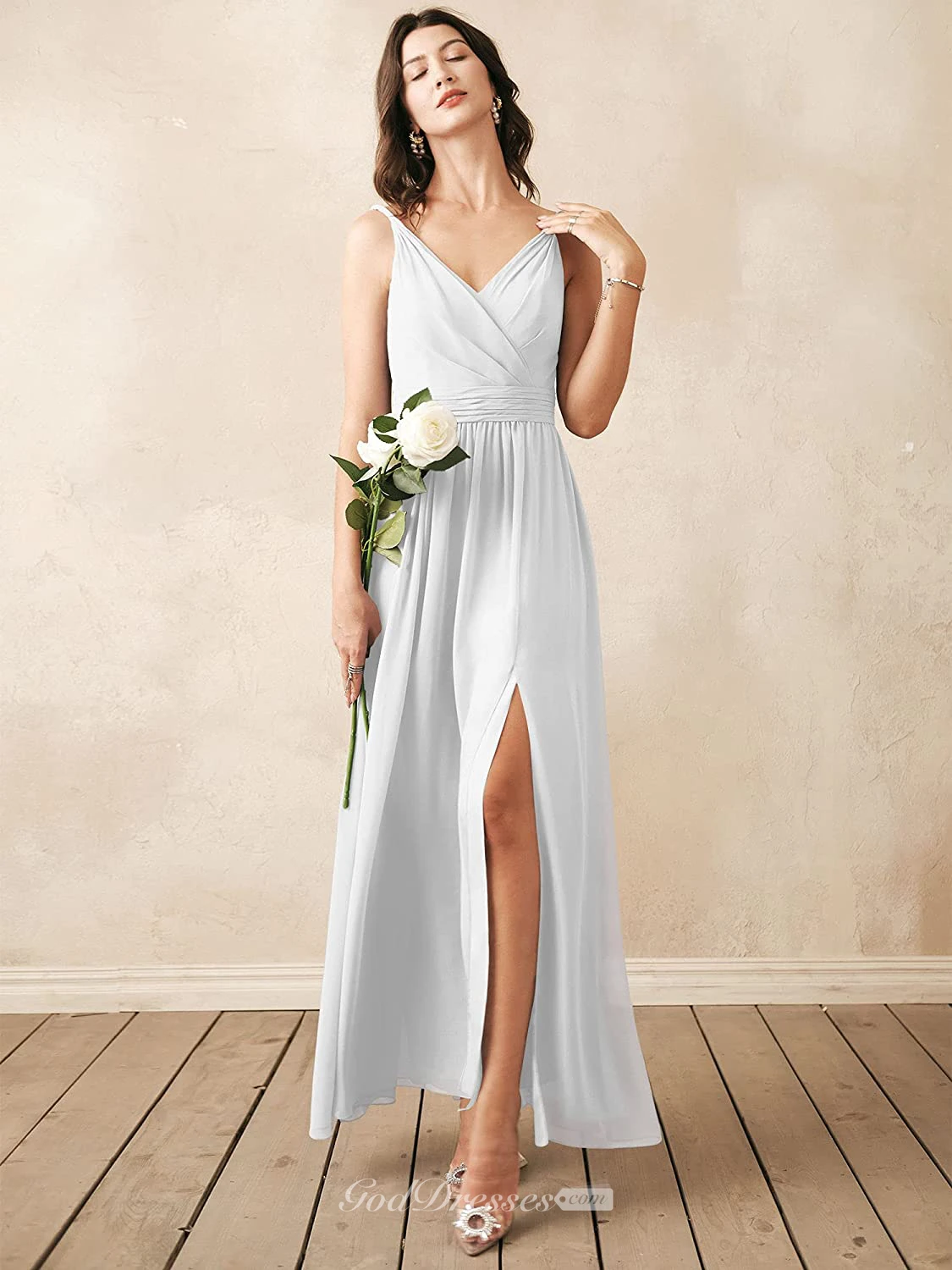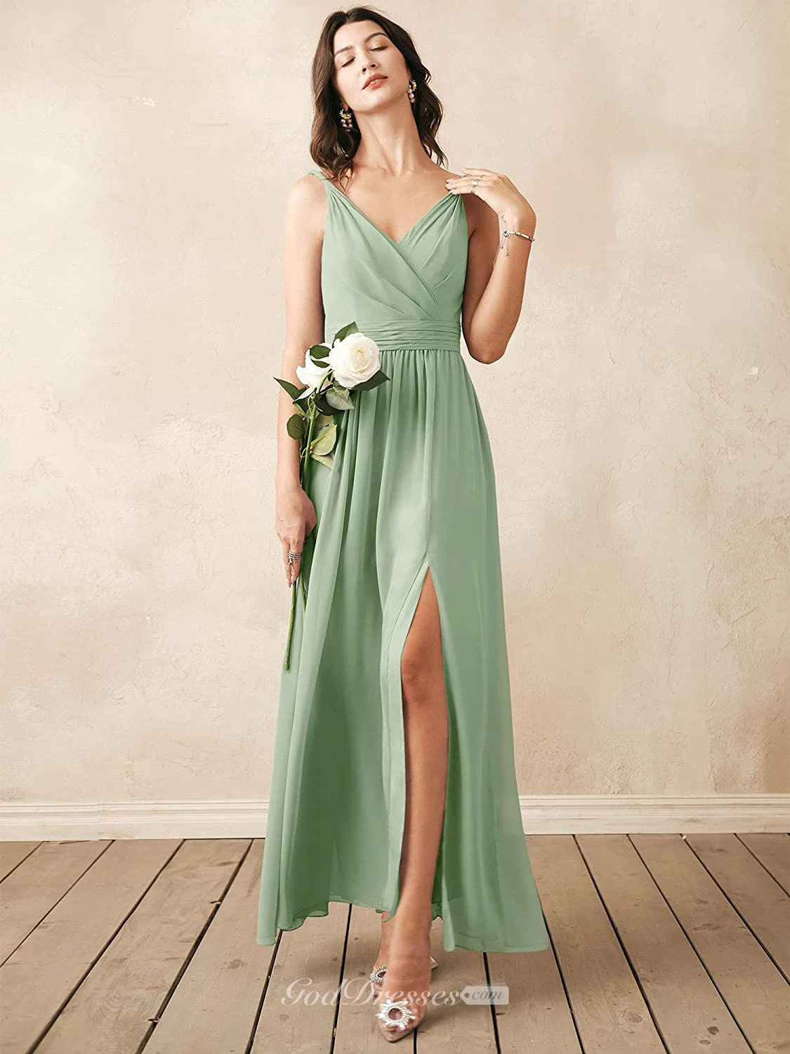 Romantic V-neck A Line Sleeveless Ankle-length Chiffon Bridesmaid Dress With Ruching