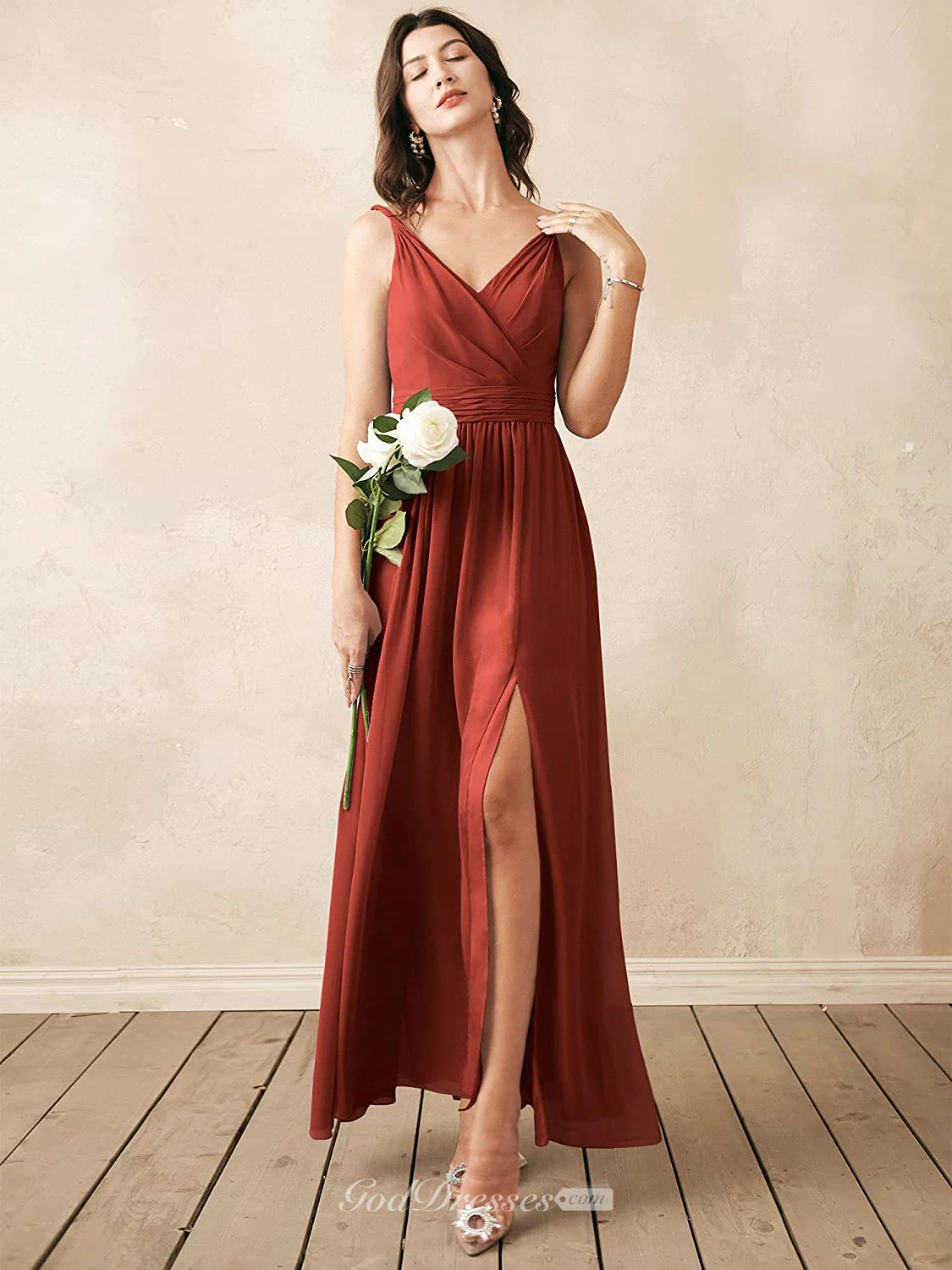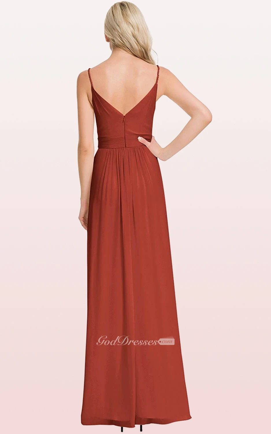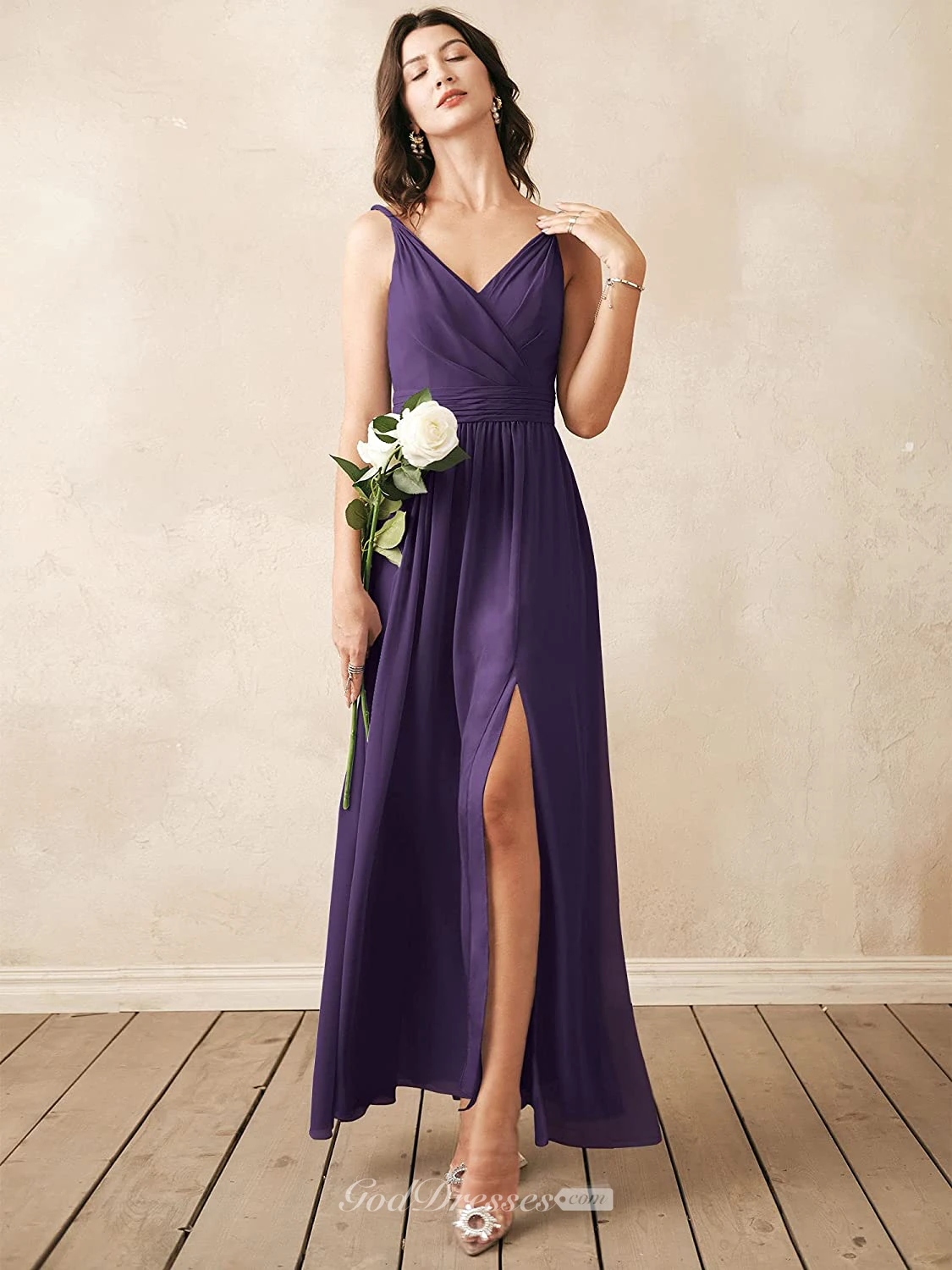 Romantic V-neck A Line Sleeveless Ankle-length Chiffon Bridesmaid Dress With Ruching