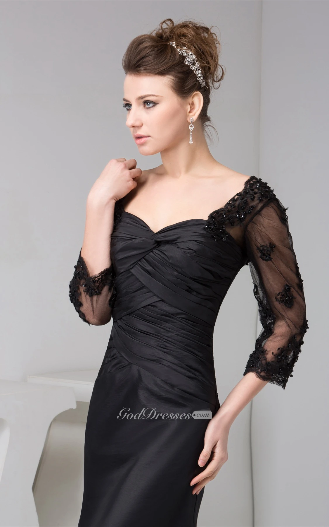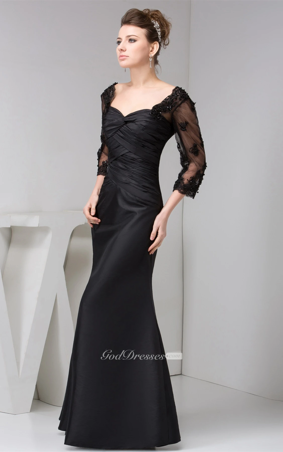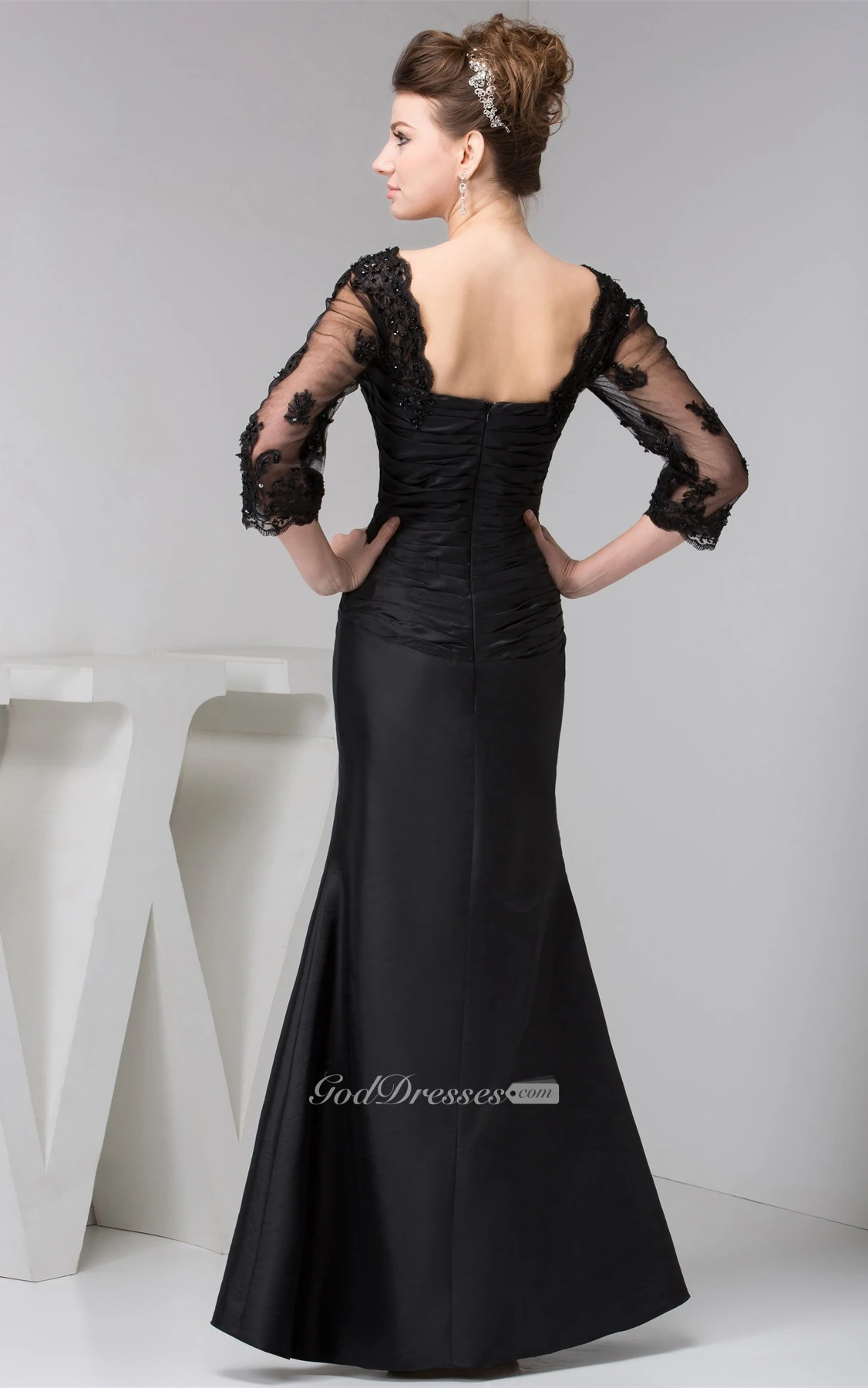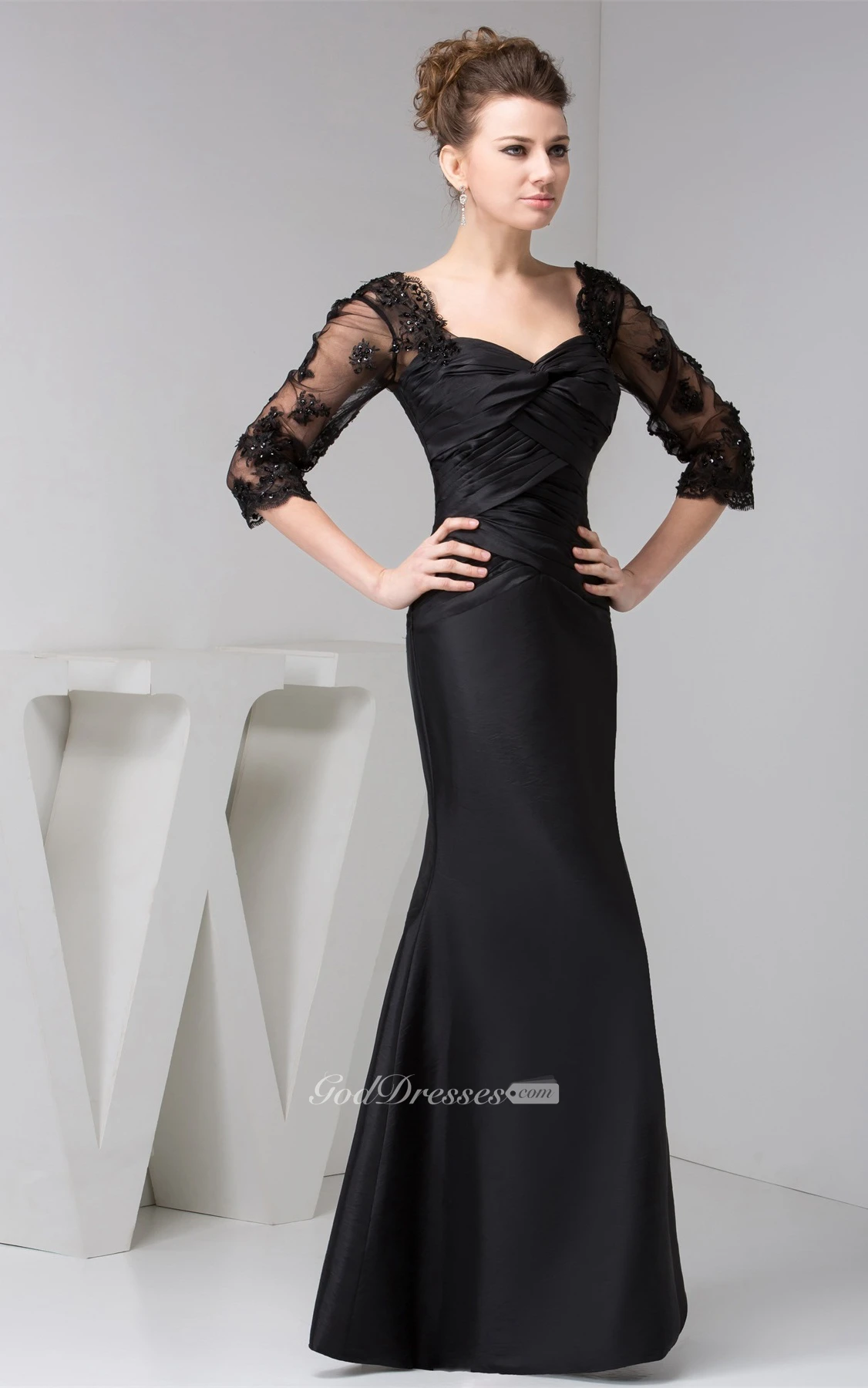Ruched Long Mermaid Dress With Illusion 3-4 Sleeve