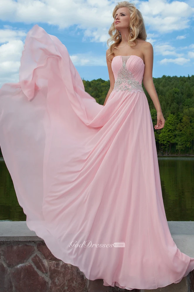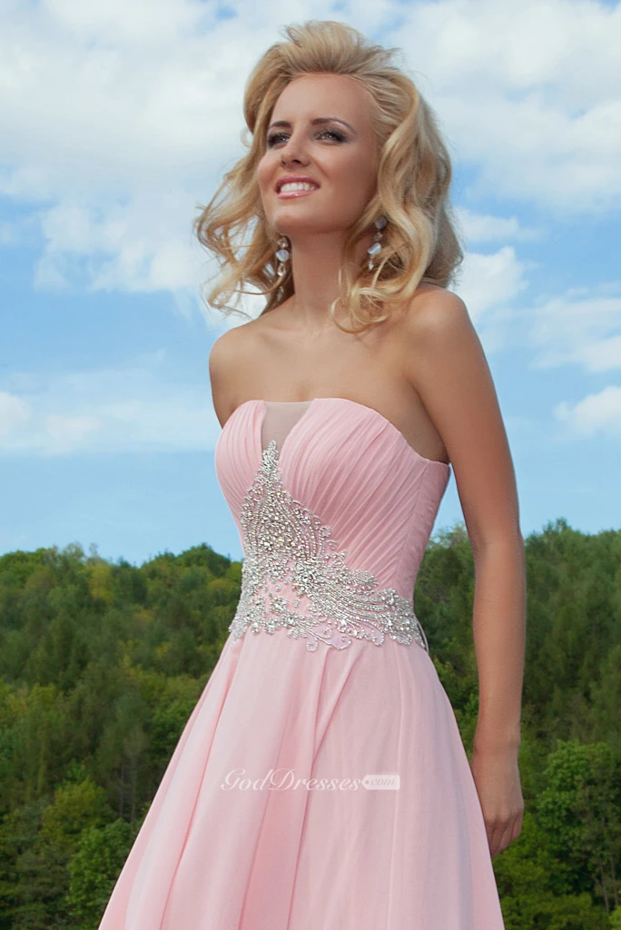 Ruched Strapless Sleeveless Long Chiffon Prom Dress With Beading