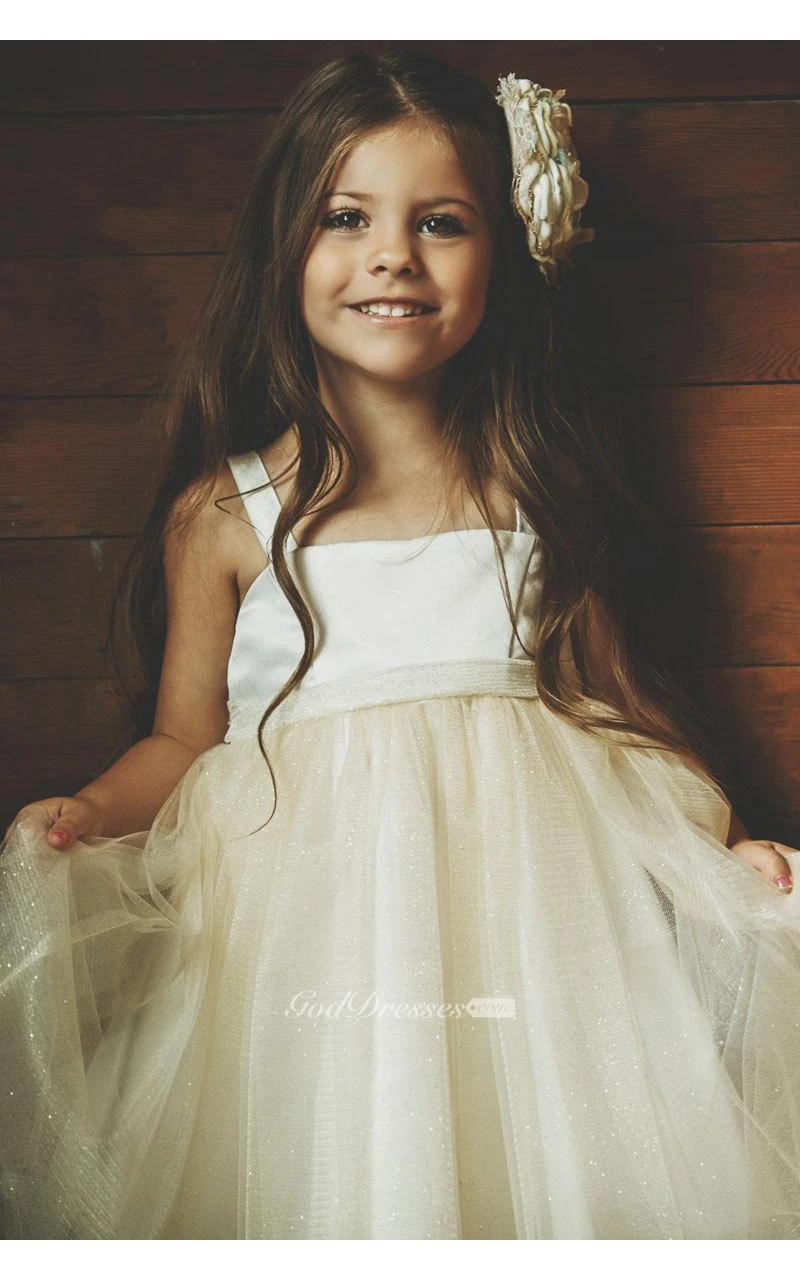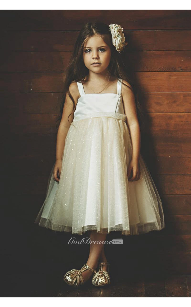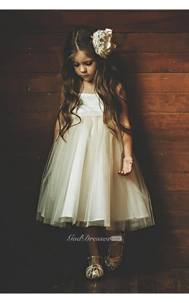 Satin Bodice Square Neck Empire A-line Tulle Tea Length Dress