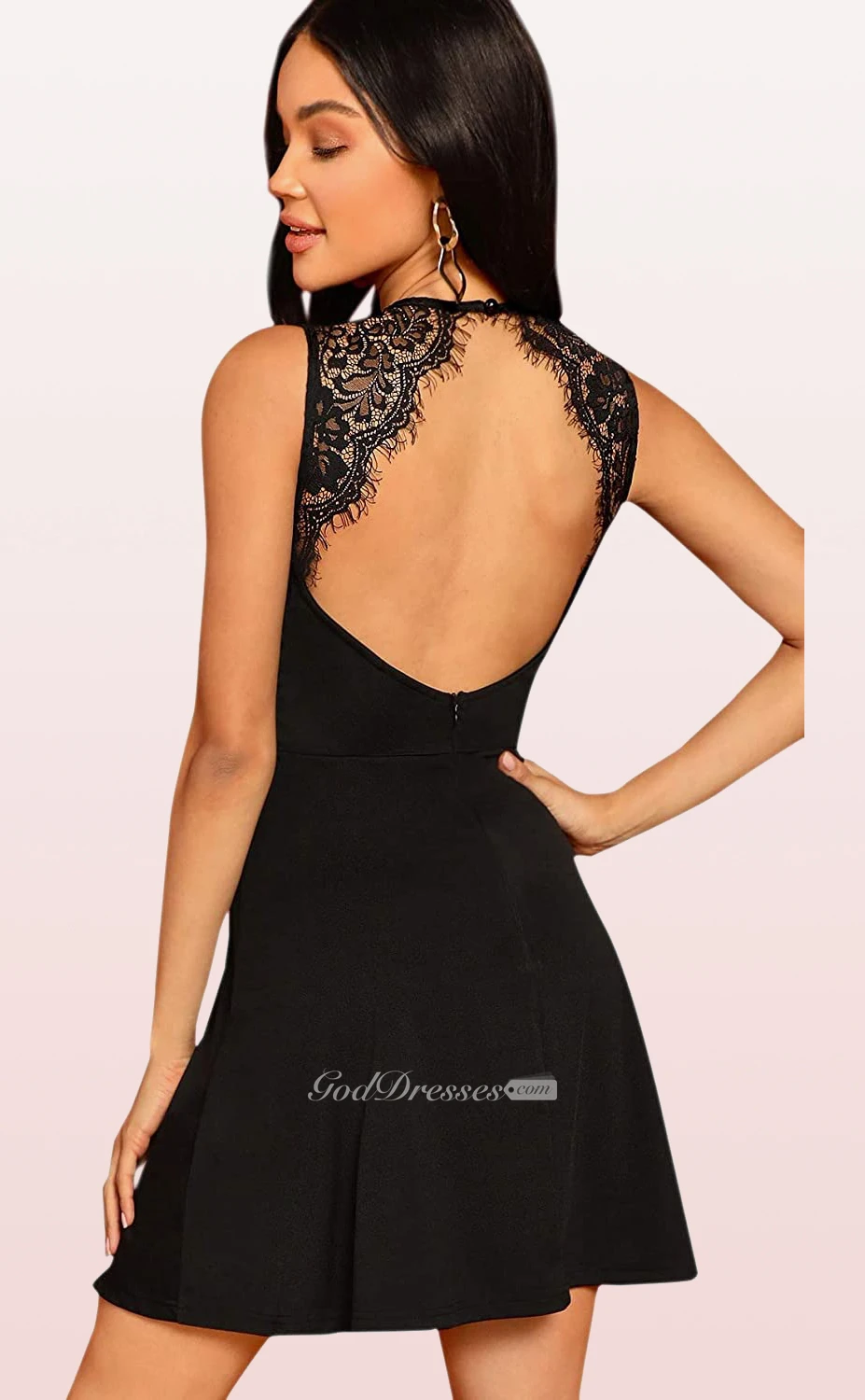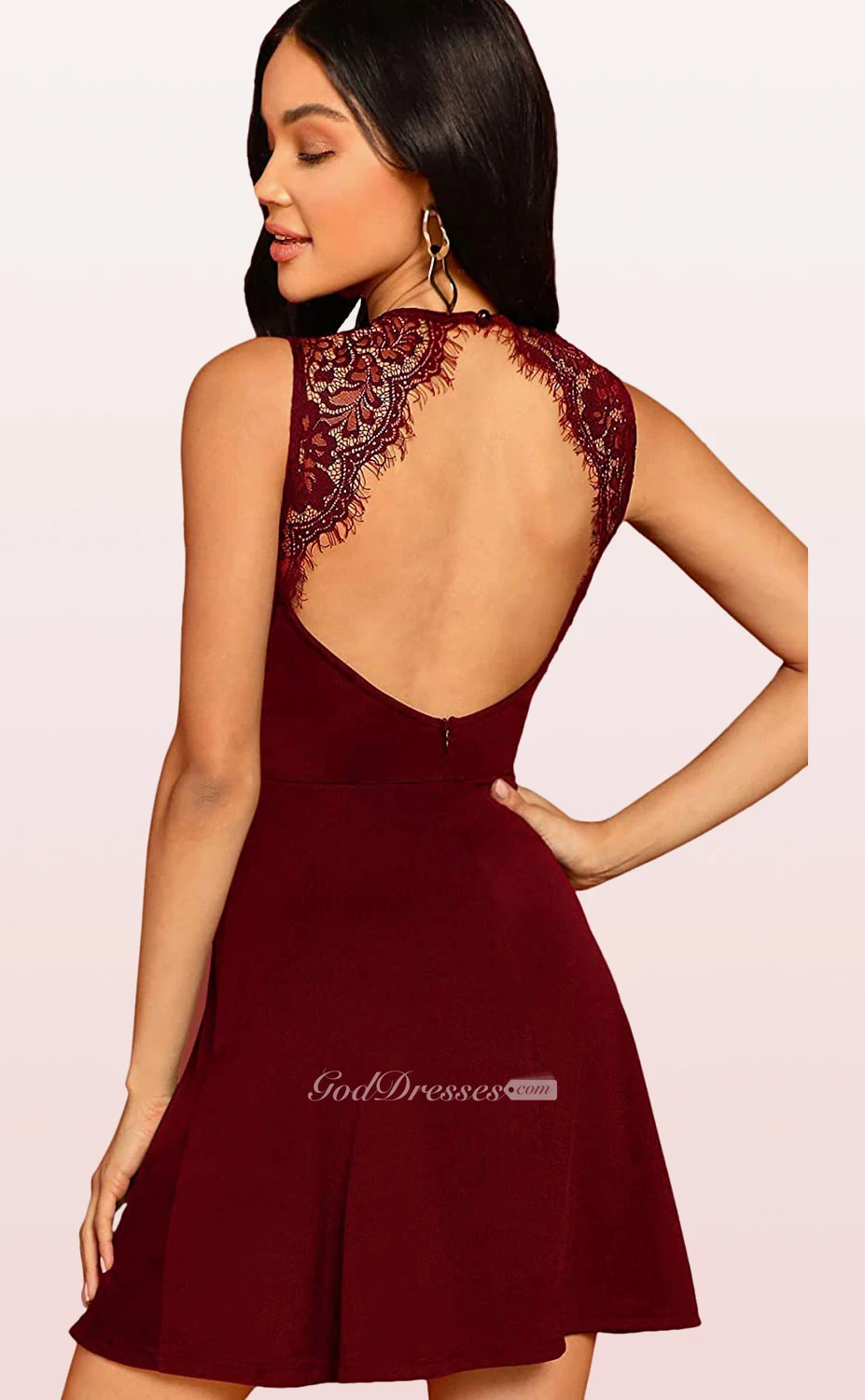 Satin Chiffon Short A Line Sleeveless Sexy Cocktail Dress with Lace