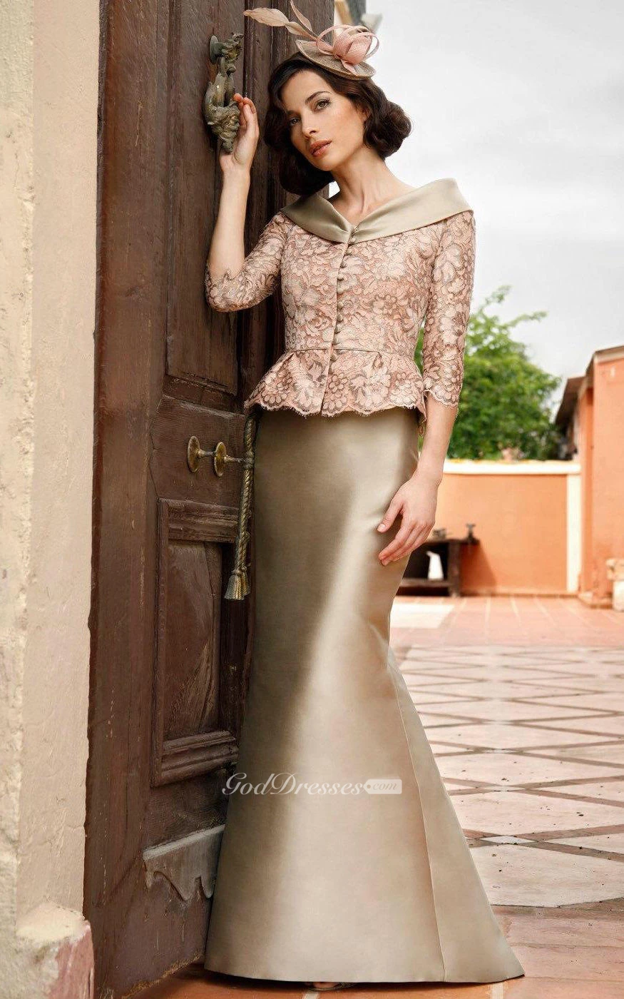 Satin Mermaid Floor Length Dress With 3-4-sleeved Lace Jacket
