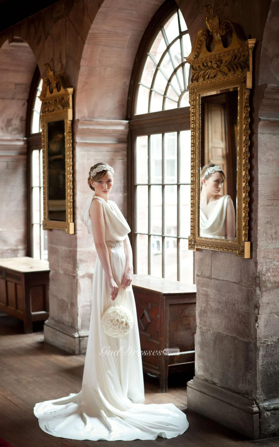 Satin Sleeveless A-Line Dress With Cowl Neck and Beaded Waistbelt