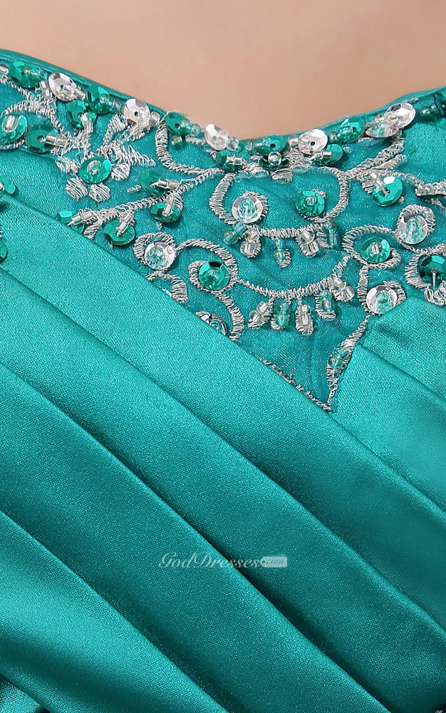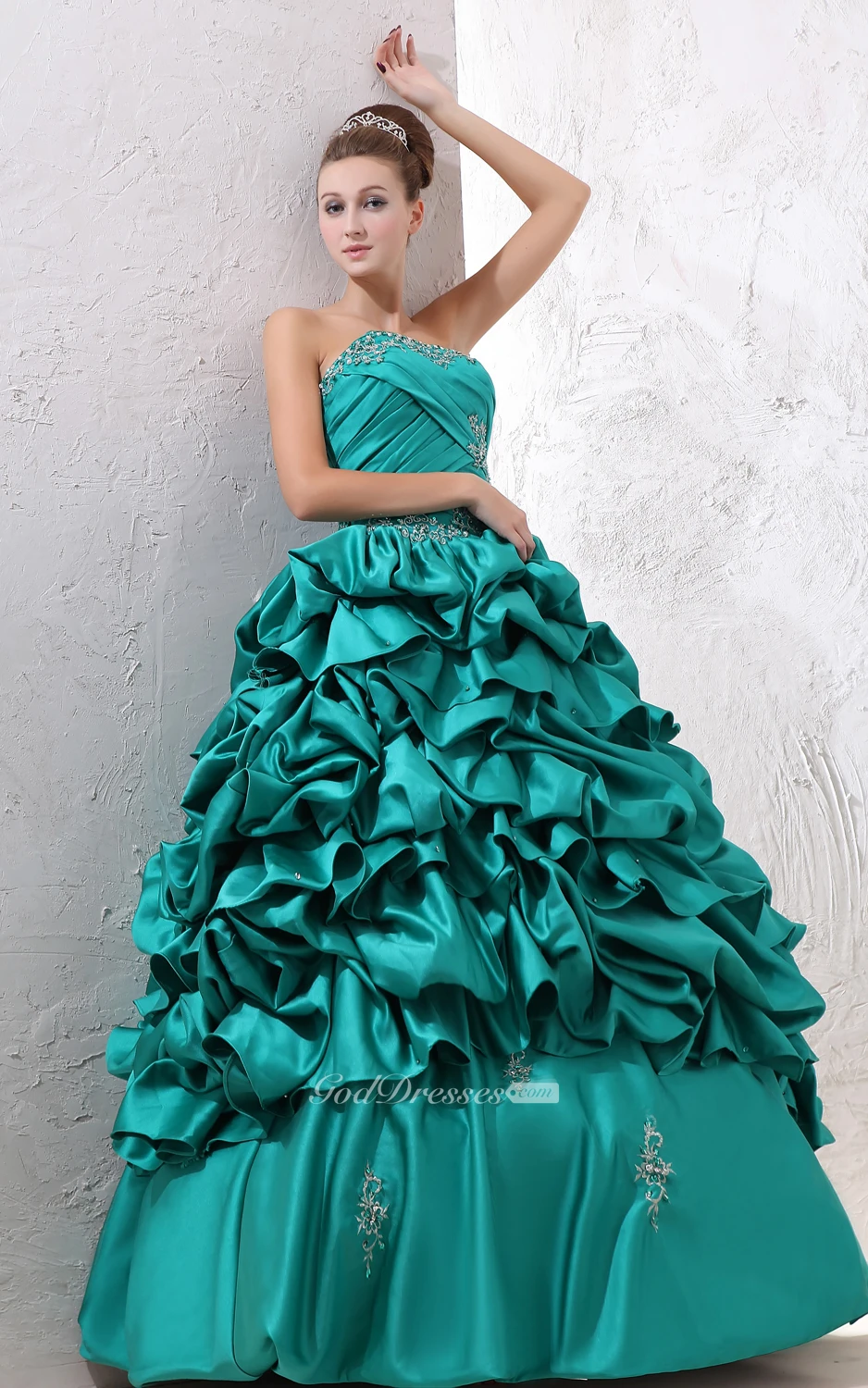 Satin Strapless Ball Gown With Ruffles and Criss-Cross Ruching
