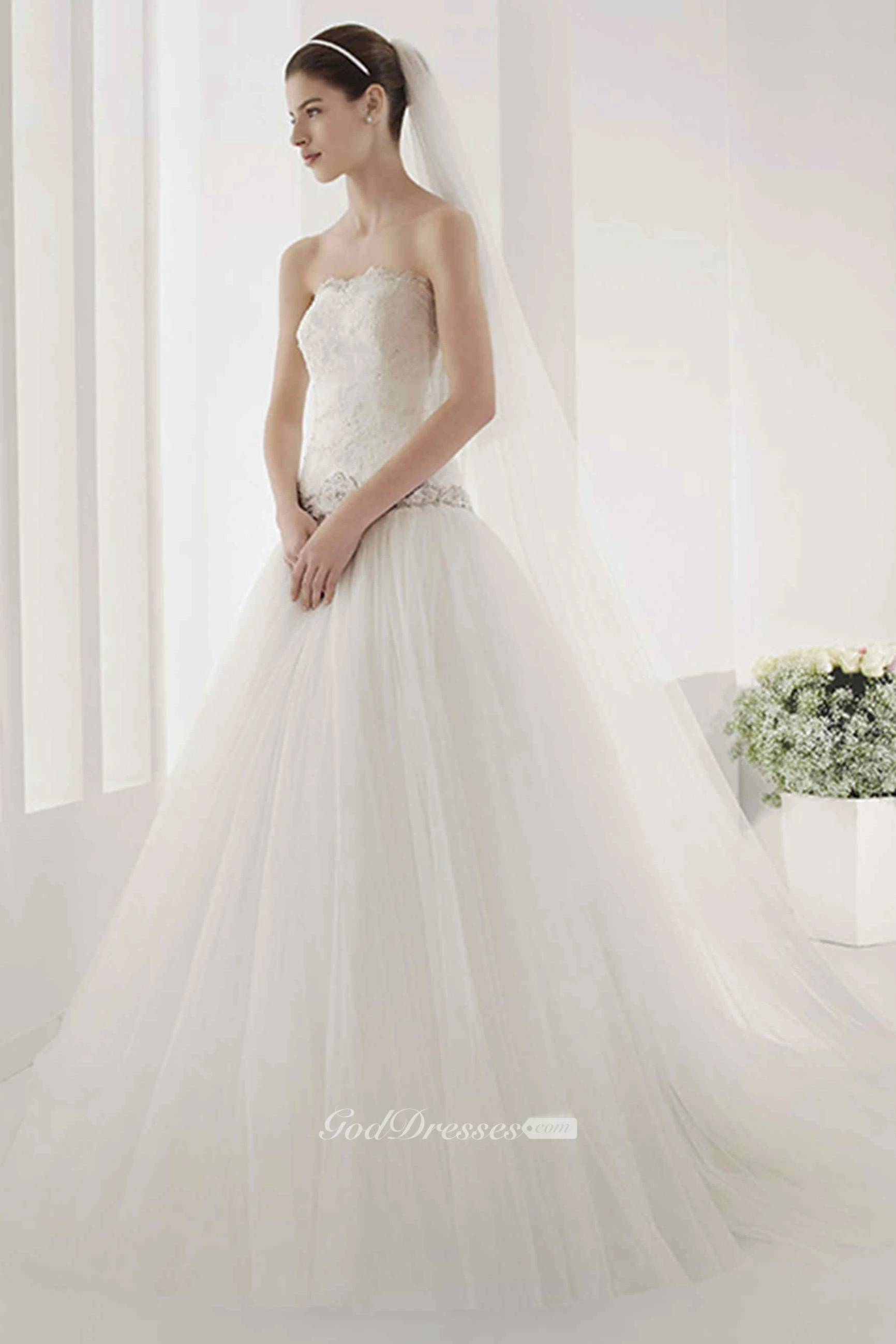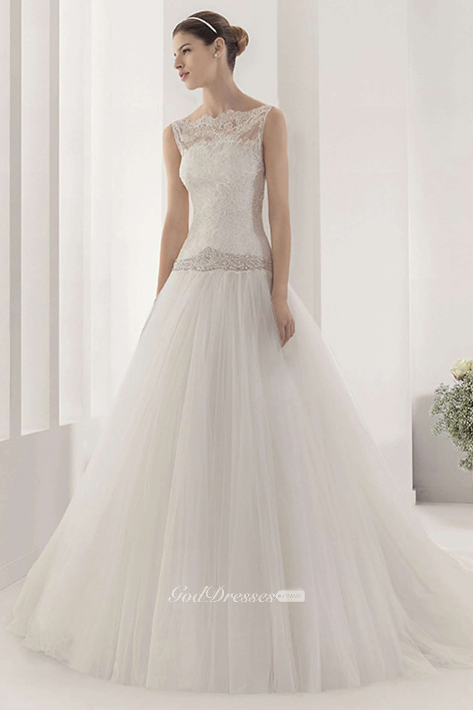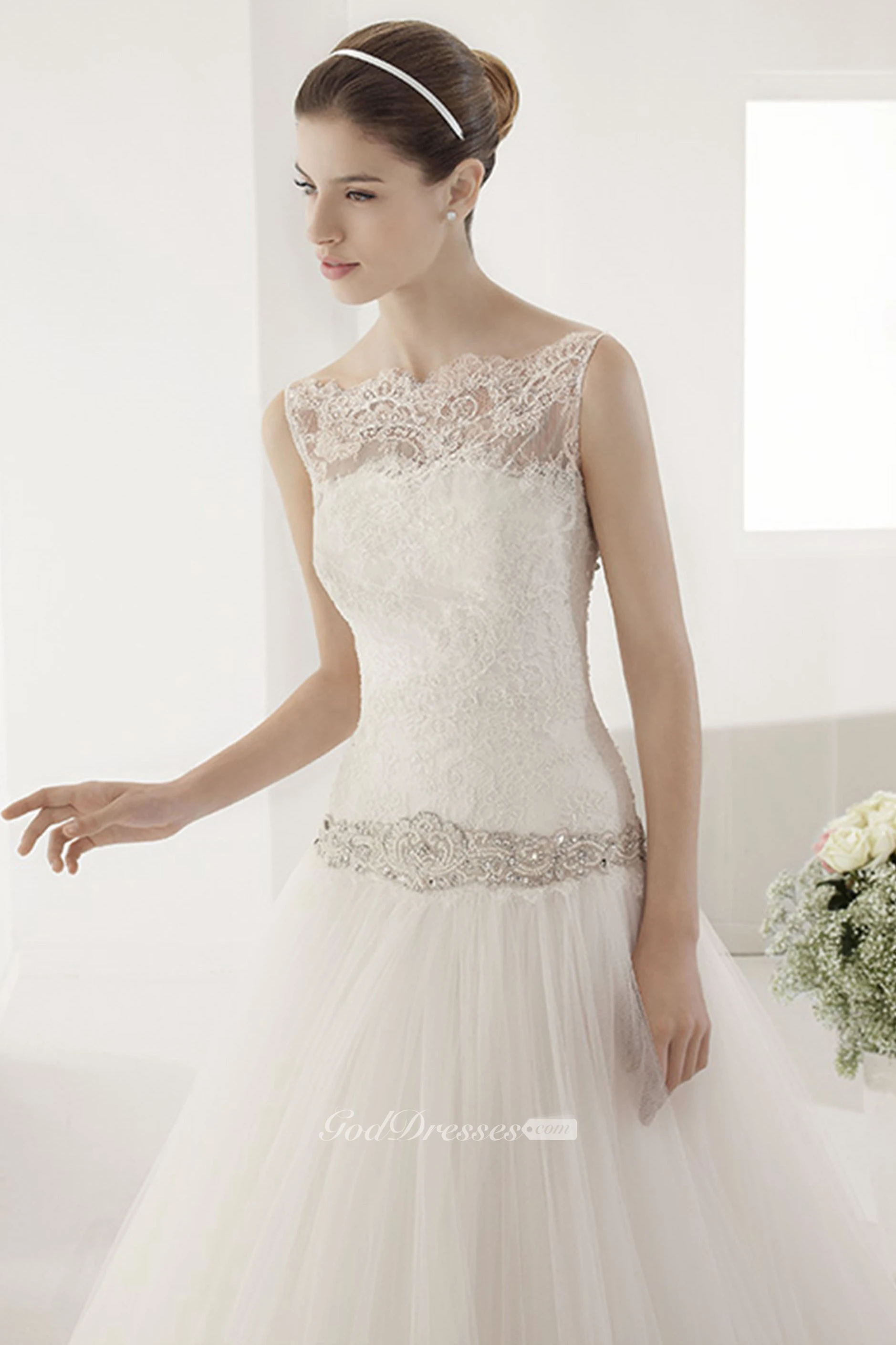 Scalloped Neck Drop Crystal Waist Tulle Ball Gown With Lace Top