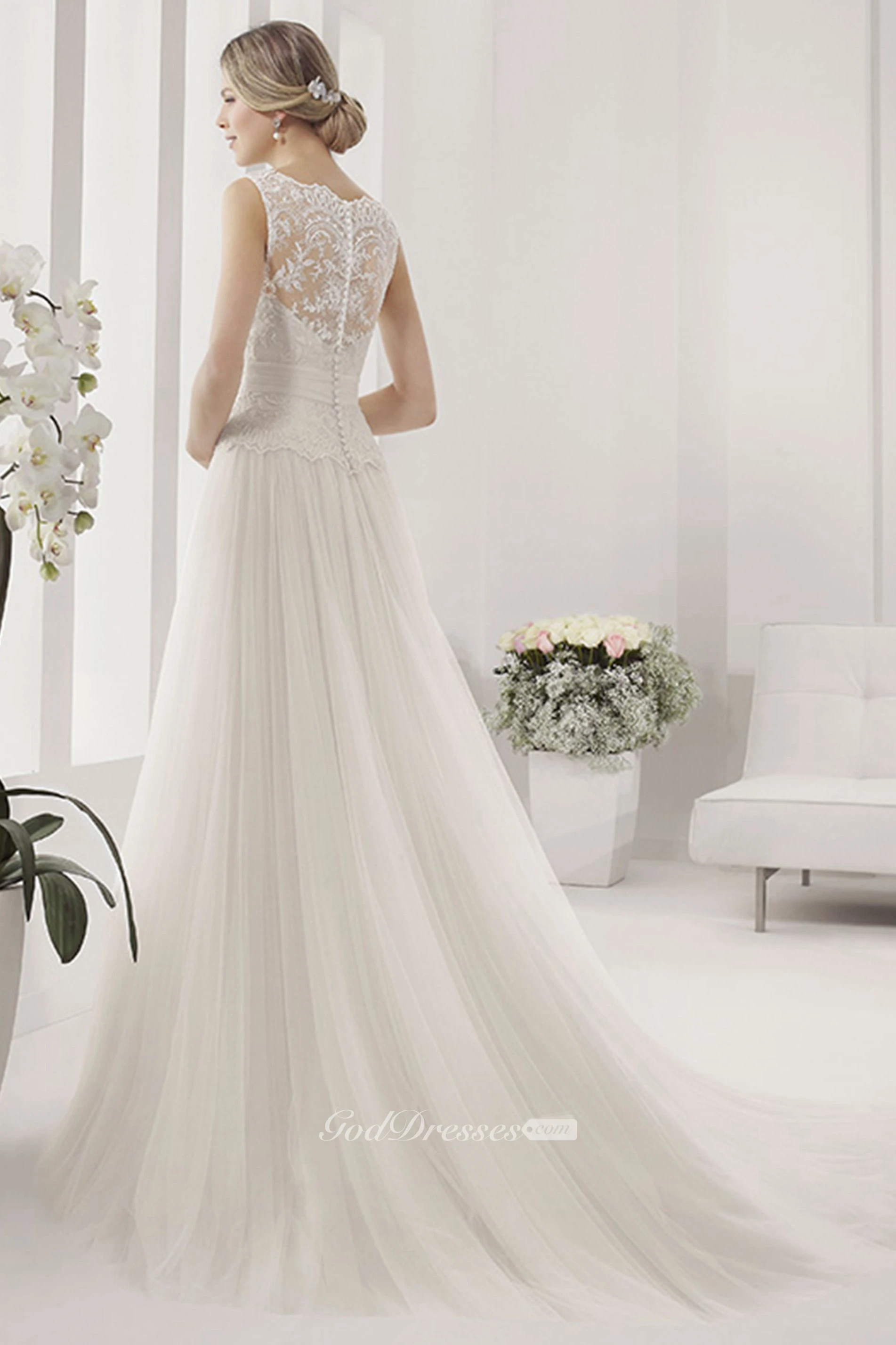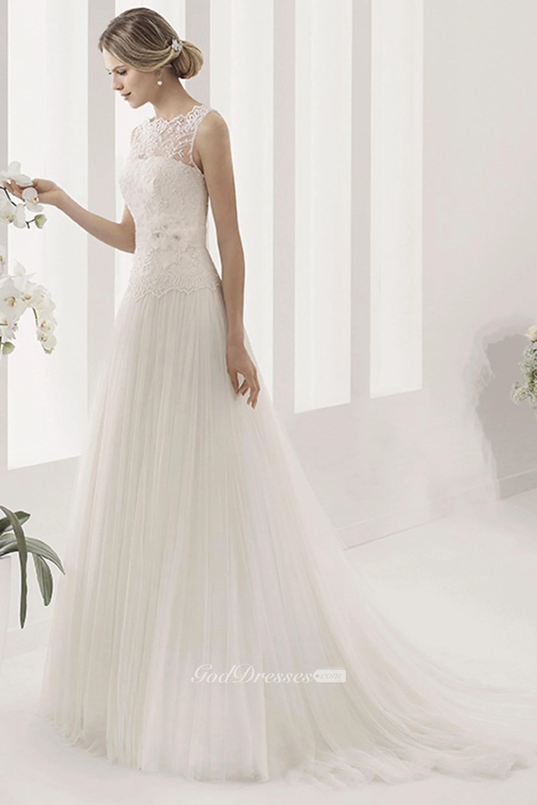 Scalloped Neck Tulle Ball Gown With Lace Bodice And Pleated Skirt
