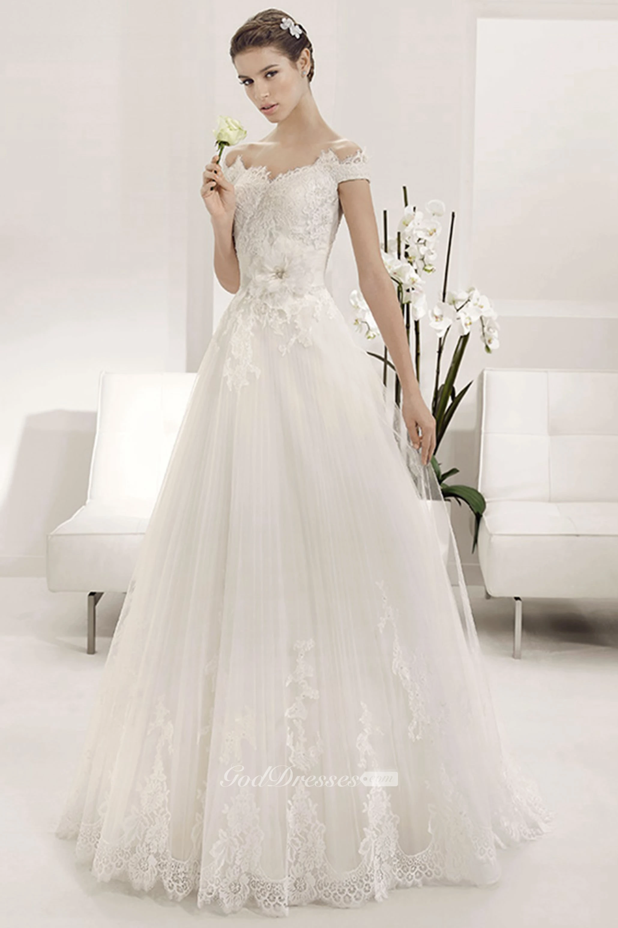 Scalloped Off Shoulder A-line Tulle Gown With Lace Top And Flower