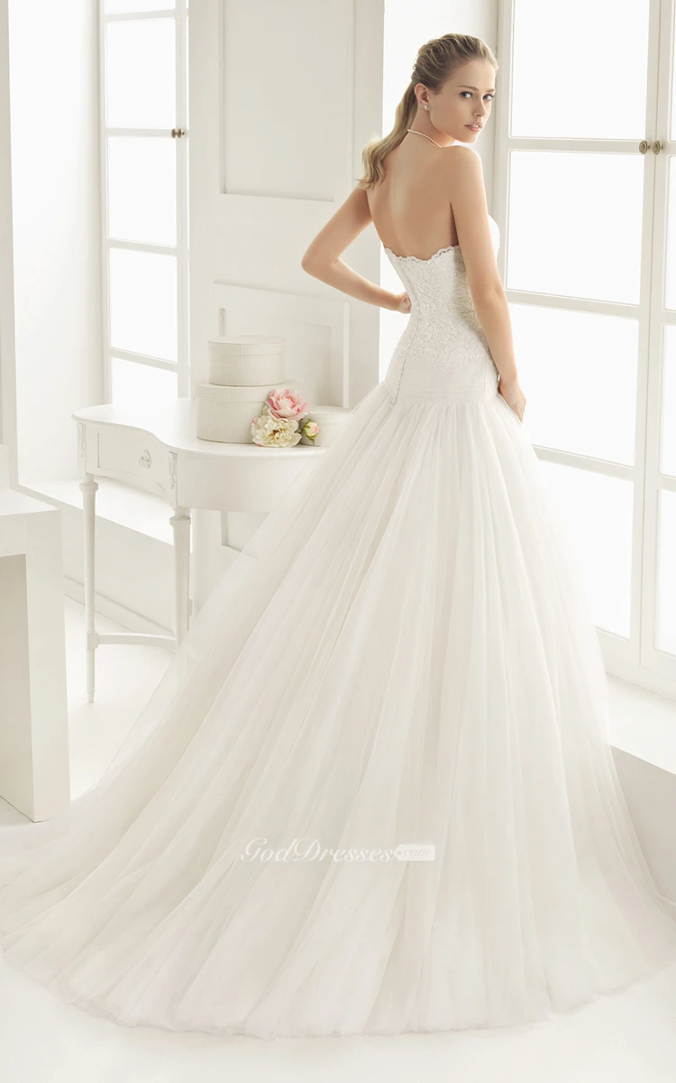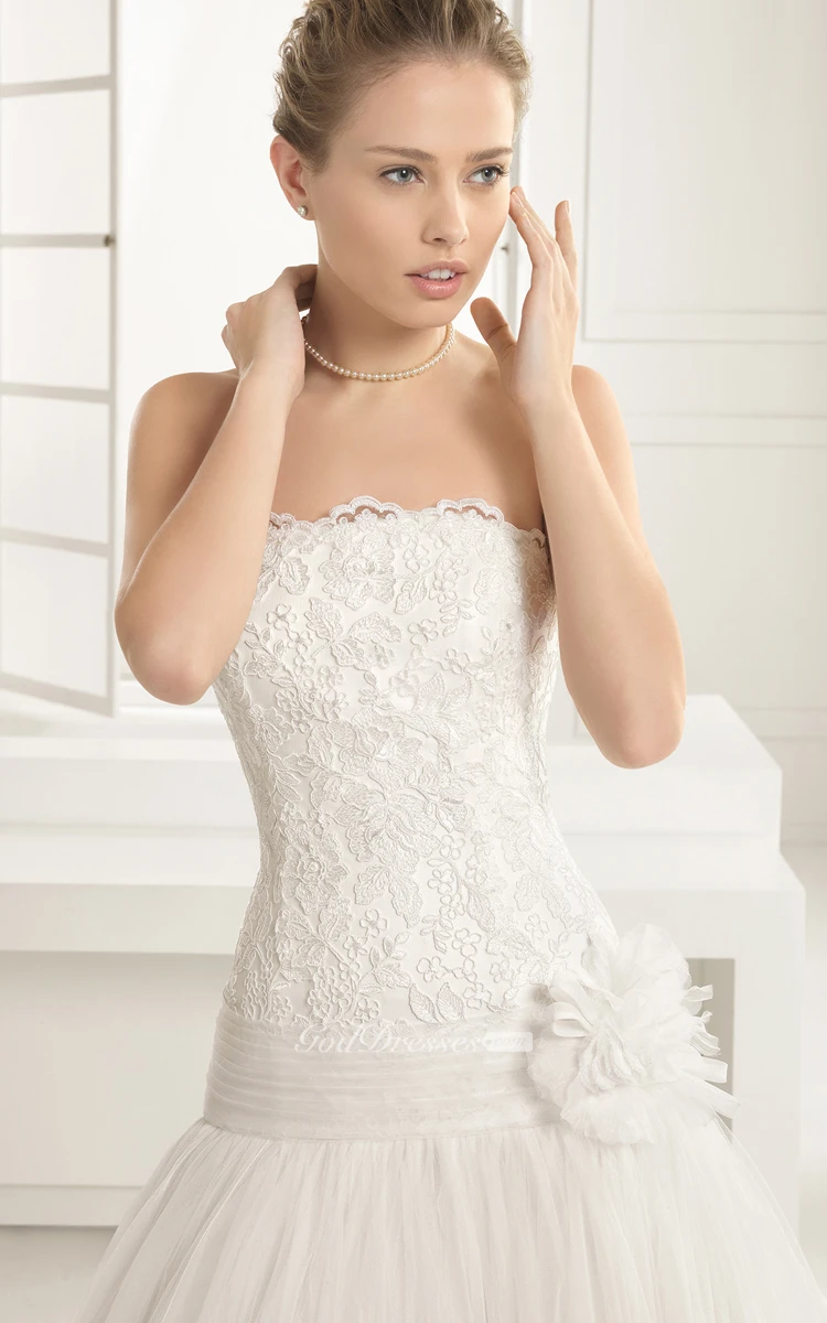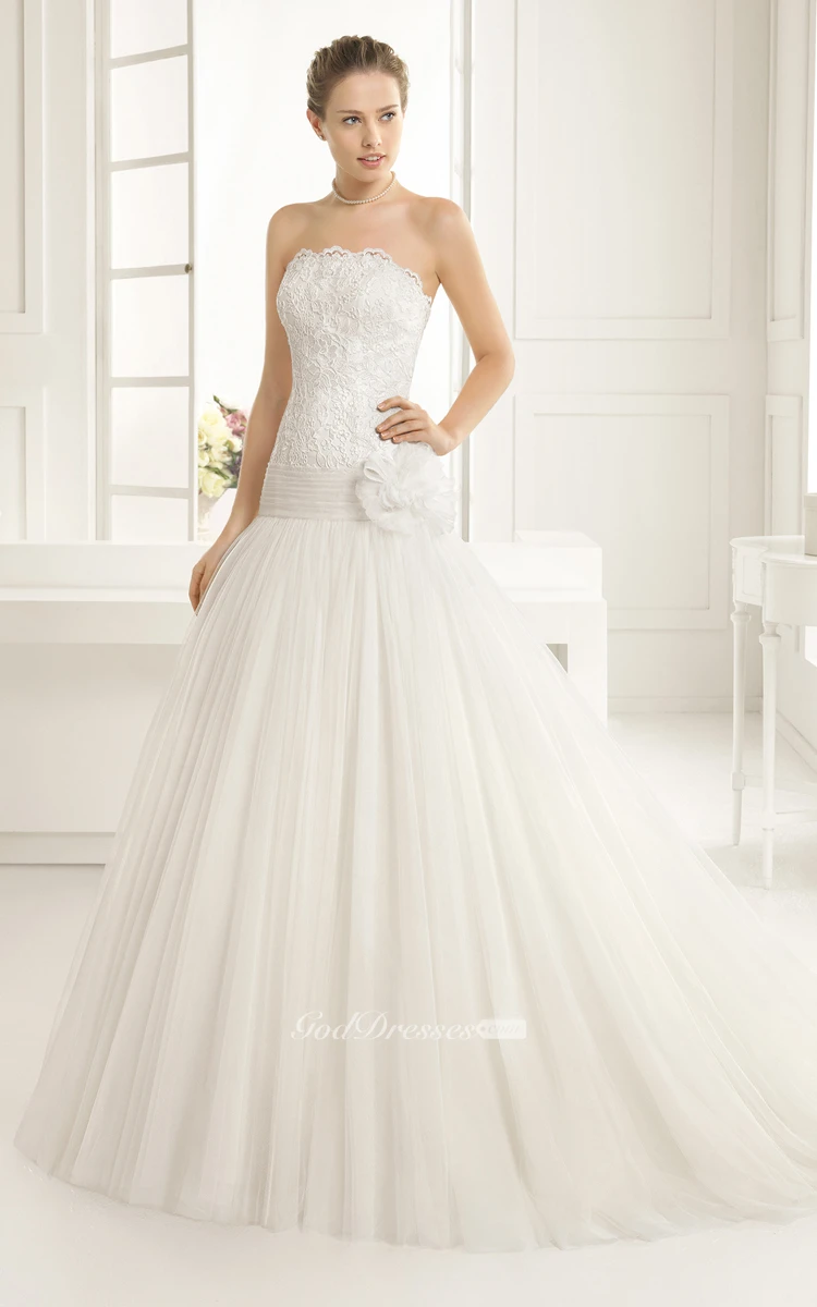 Scalloped Strapless Gown With Dropped Waistline And Flower