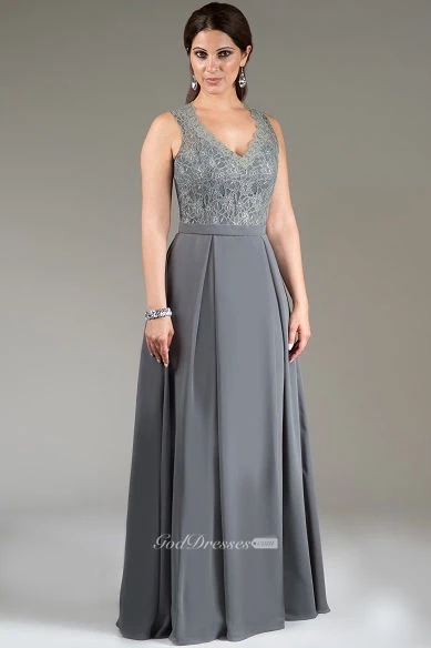 Scalloped V Neck Lace Top A-Line Pleated Long Mother Of The Bride Dress With Back Keyhole
