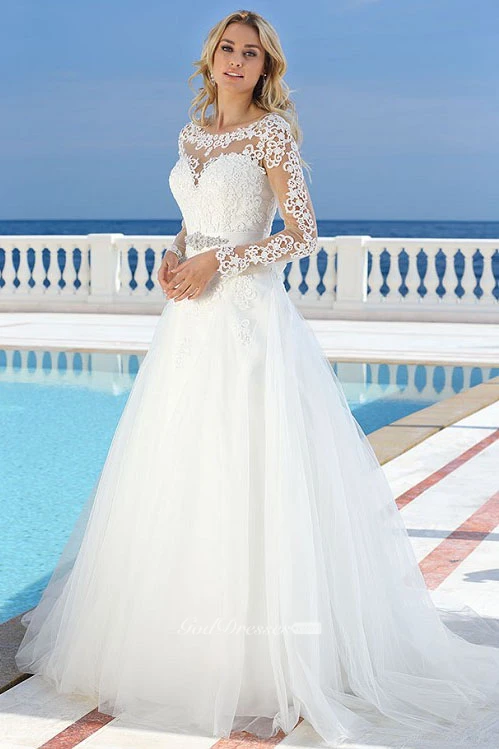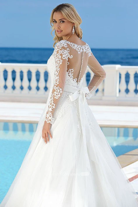 Scoop Floor-Length Long-Sleeve Appliqued Tulle Wedding Dress