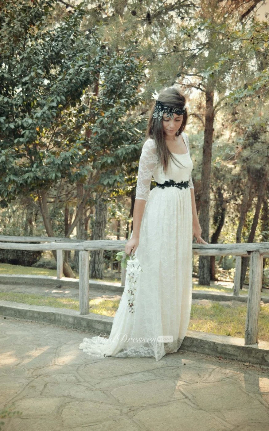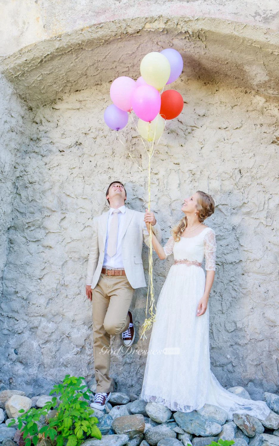 Scoop Half Illusion Sleeve Lace Wedding Dress With Sash And Button Back