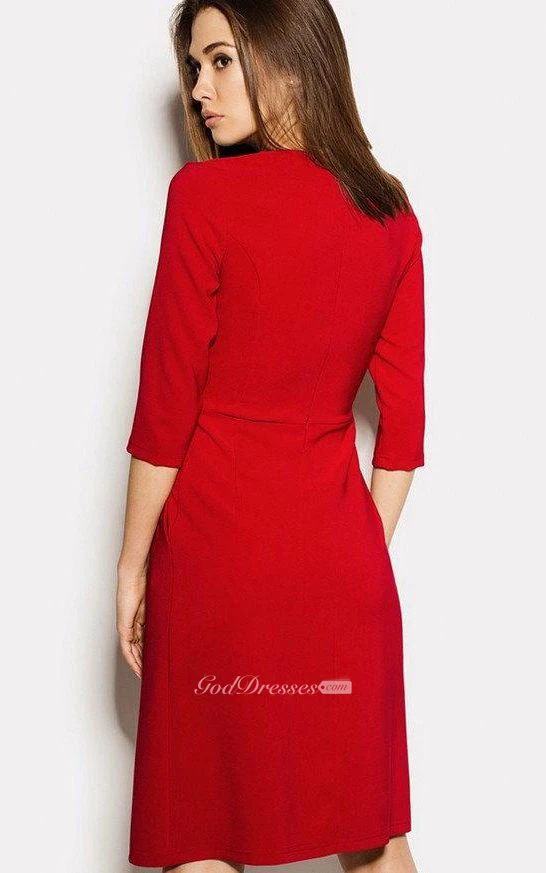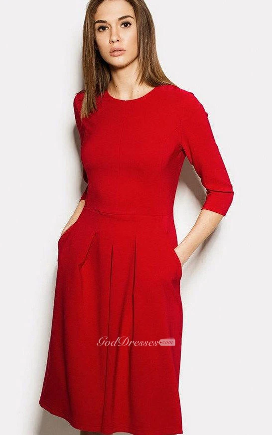 Scoop Neck 3-4 Sleeve A-line Pleated Jersey Dress With Pockets