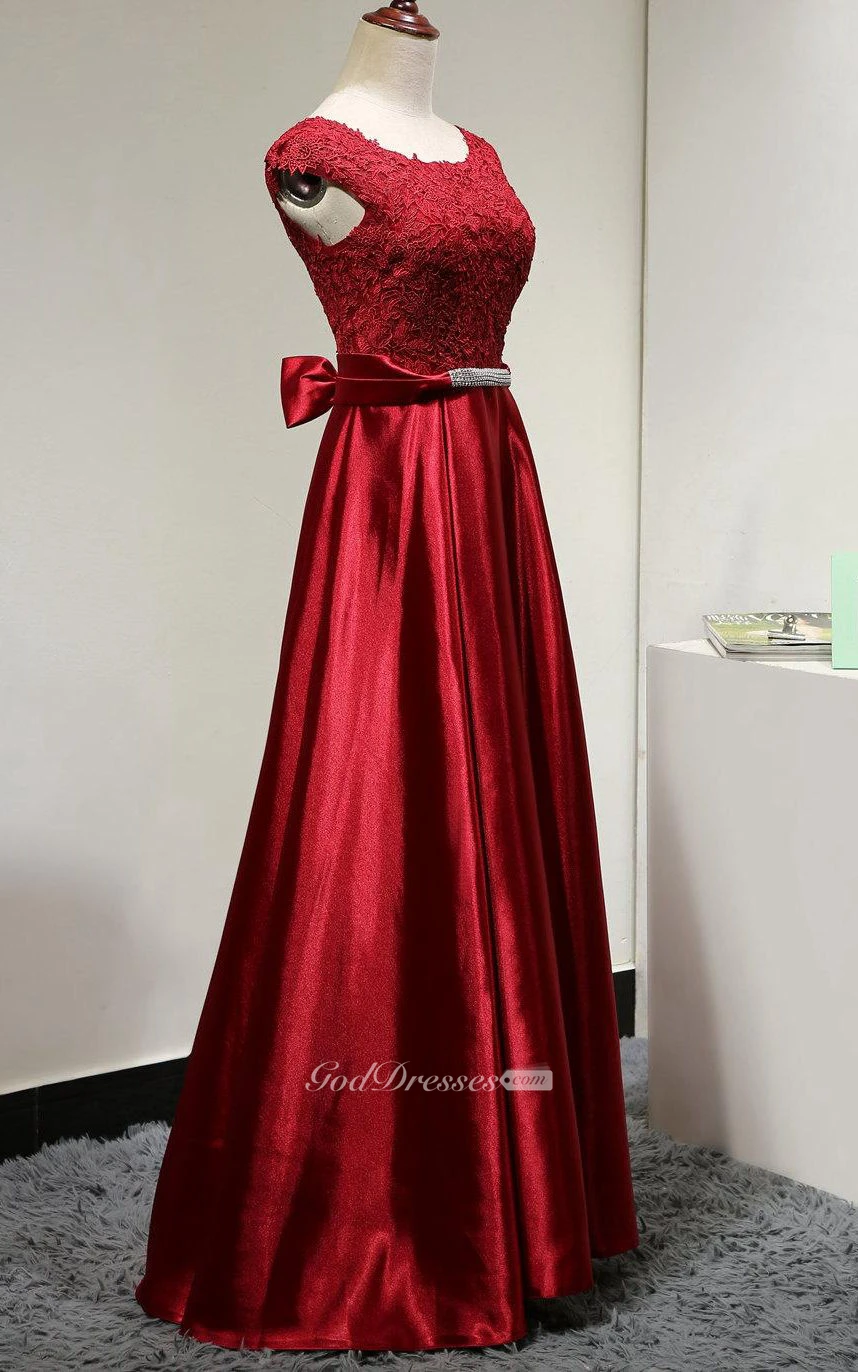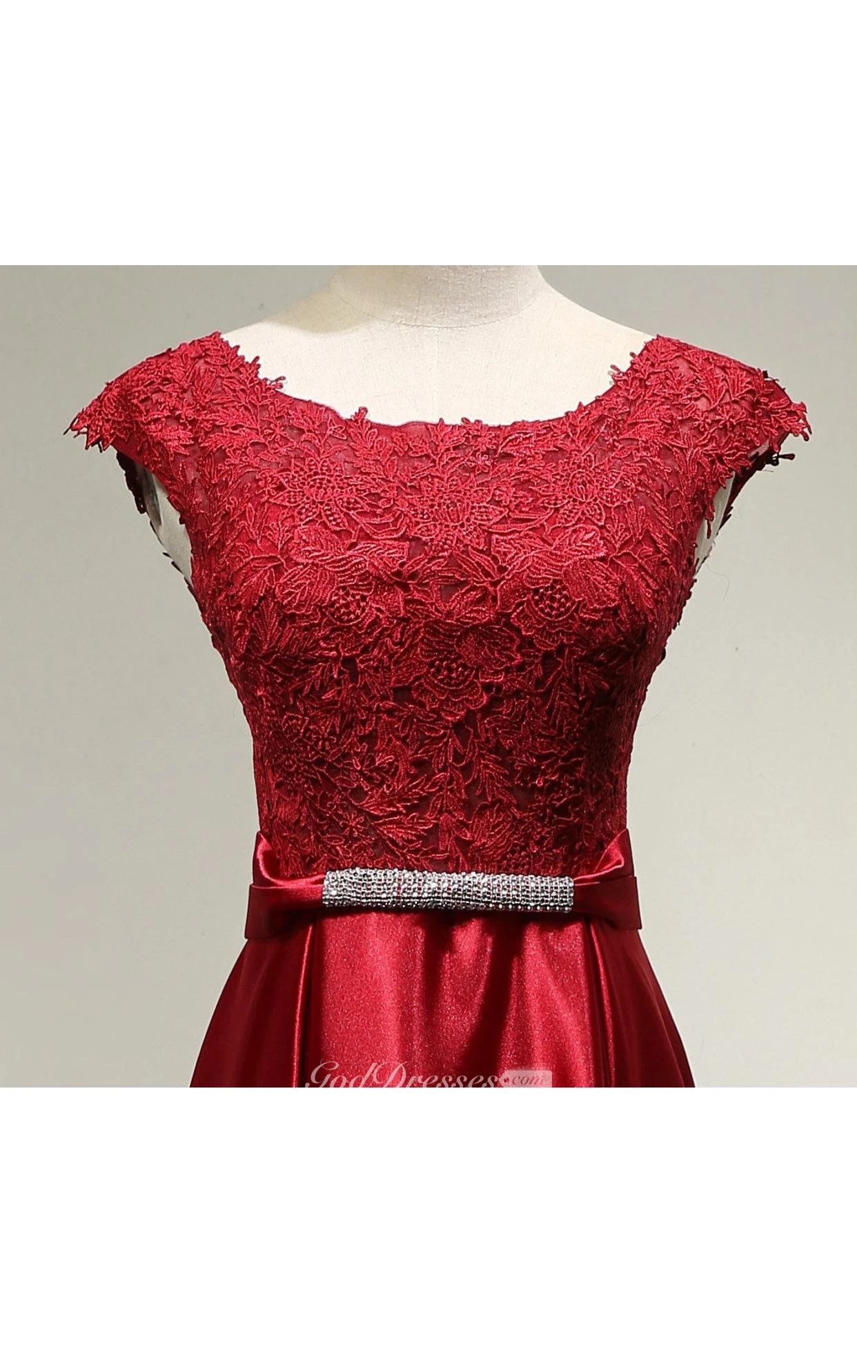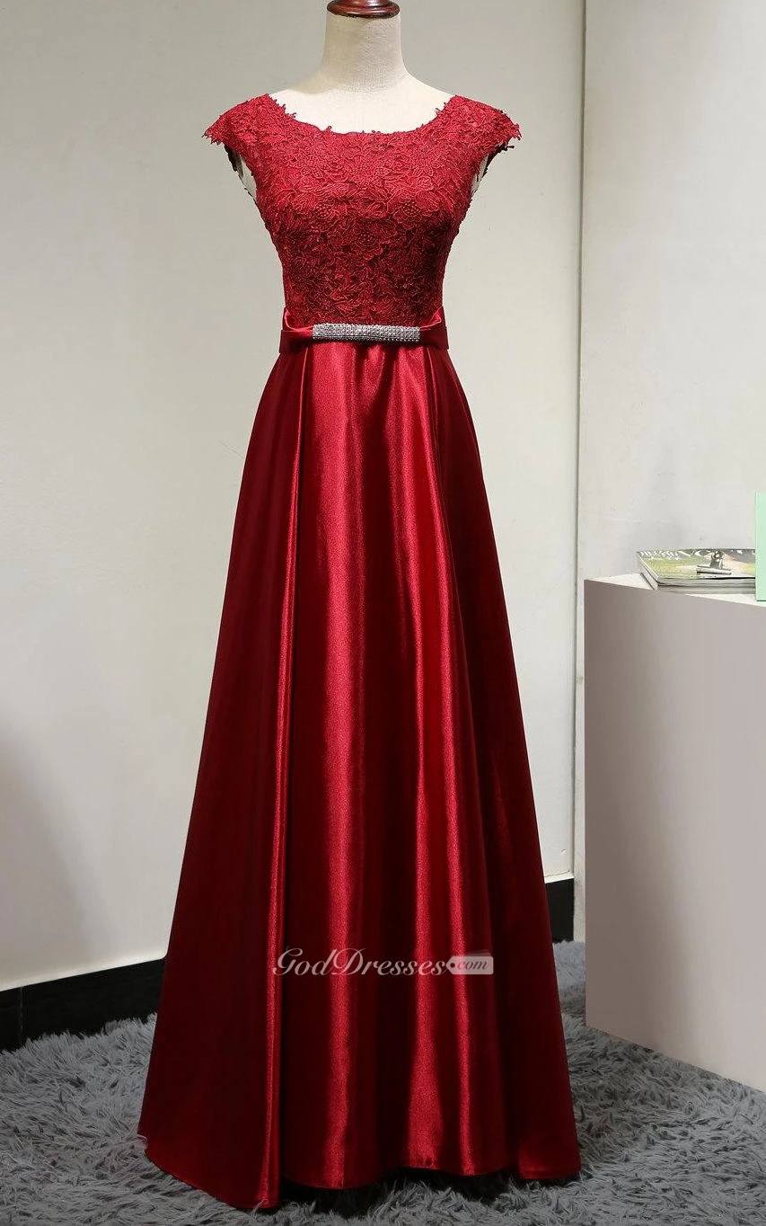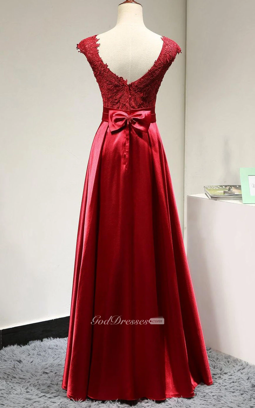 Scoop Neck Cap Sleeve Lace Bodice Satin A-line Long Dress With U Back