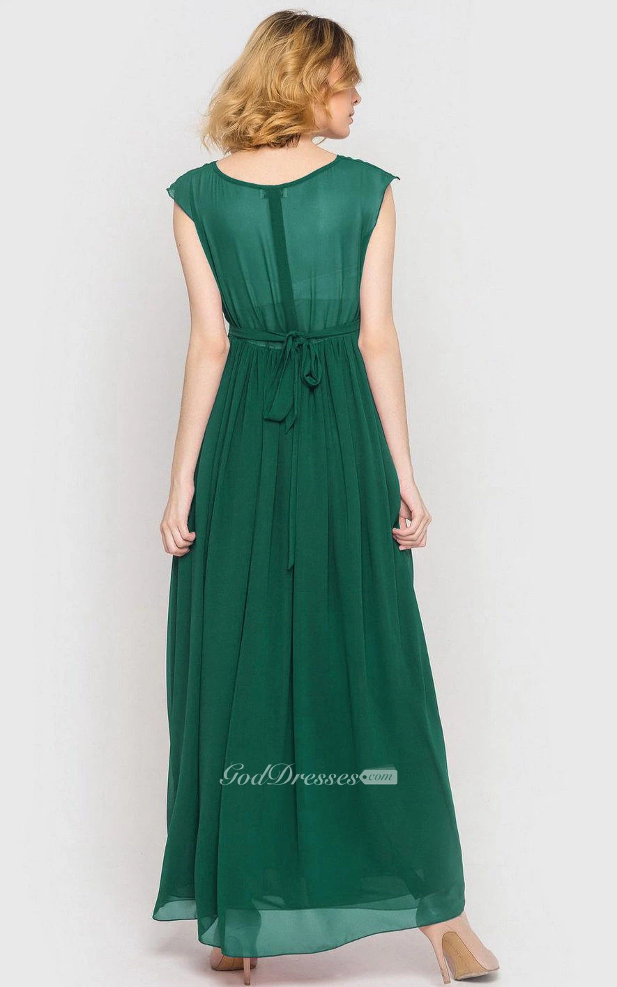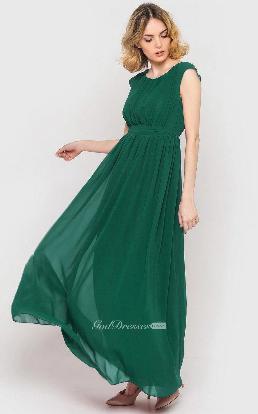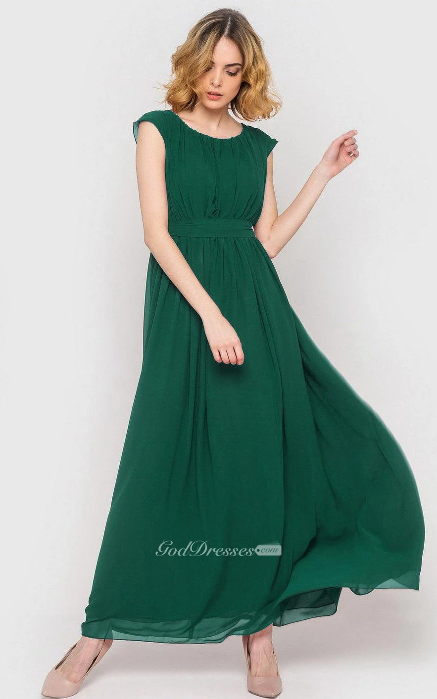 Scoop Neck Cap Sleeve Pleated A-line Chiffon Ankle Length Dress Forest Green